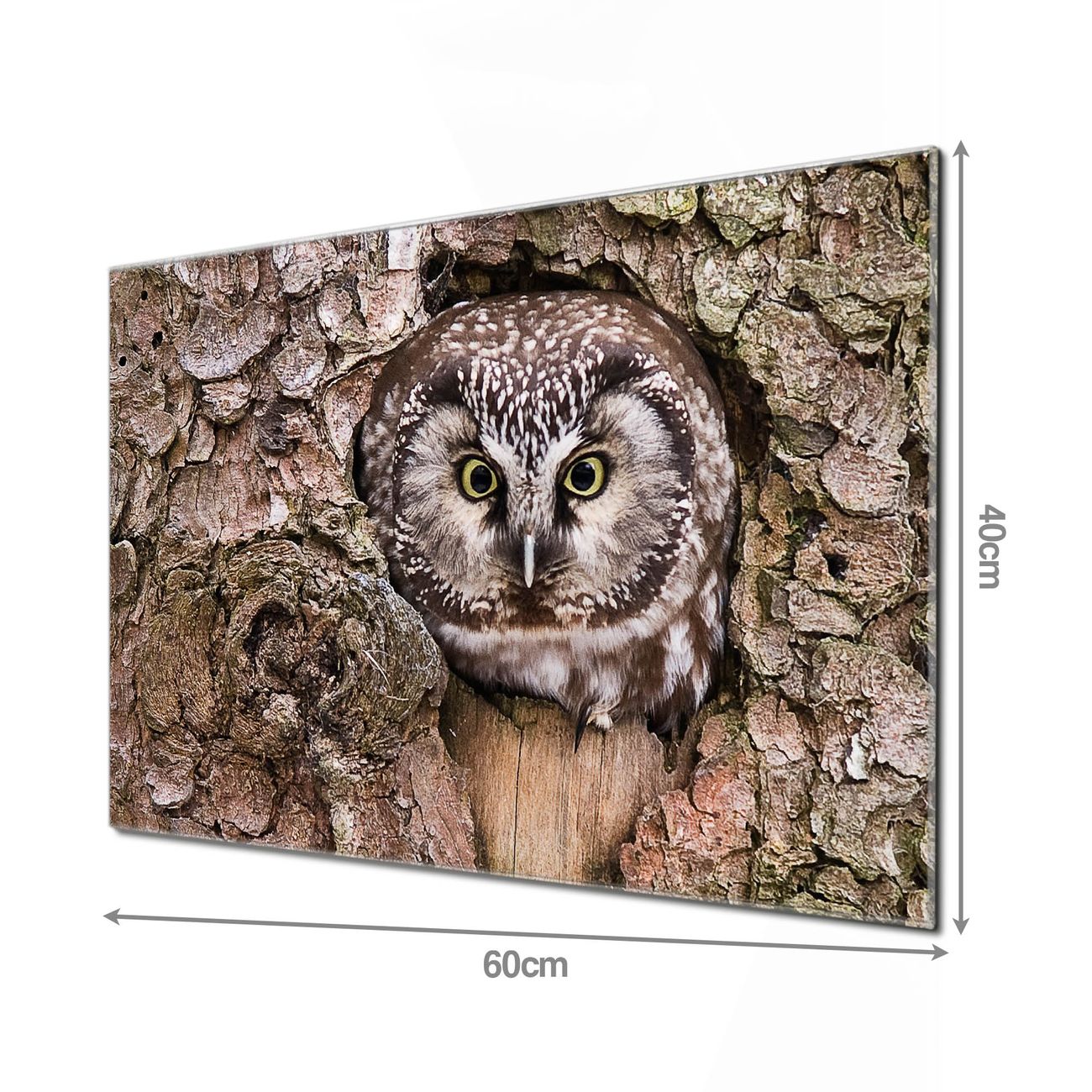 Material: 4mm Sicherheitsglas mit Metallrückwand Eigenschaften: beschreibbar, magnetisch, kratzfest Maße: 60x40x0,6cm, 3,6kg schwer Motiv Nummer 10414 Eule Zubehör: inklusive 4 Neodym-Magnete