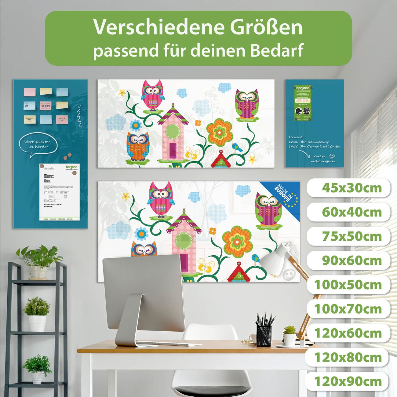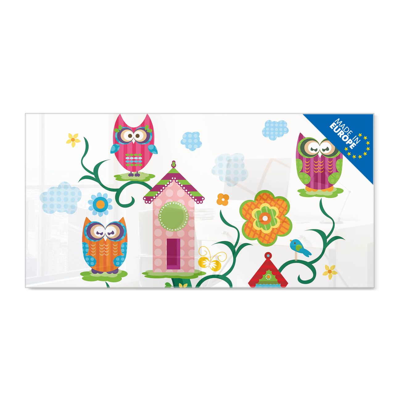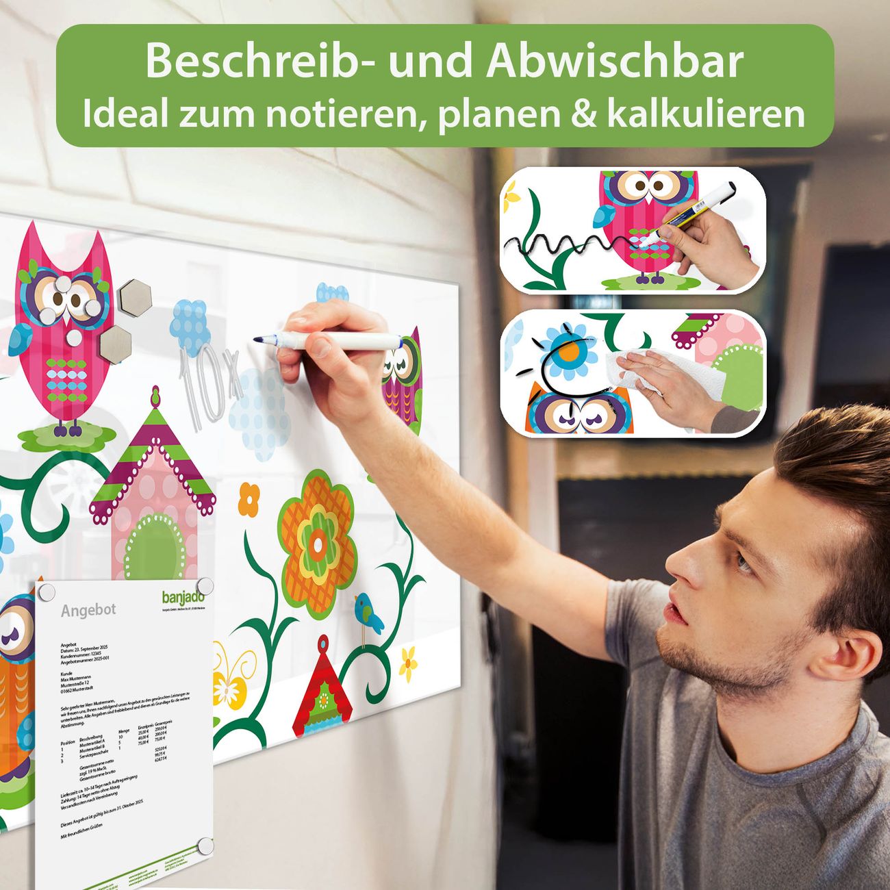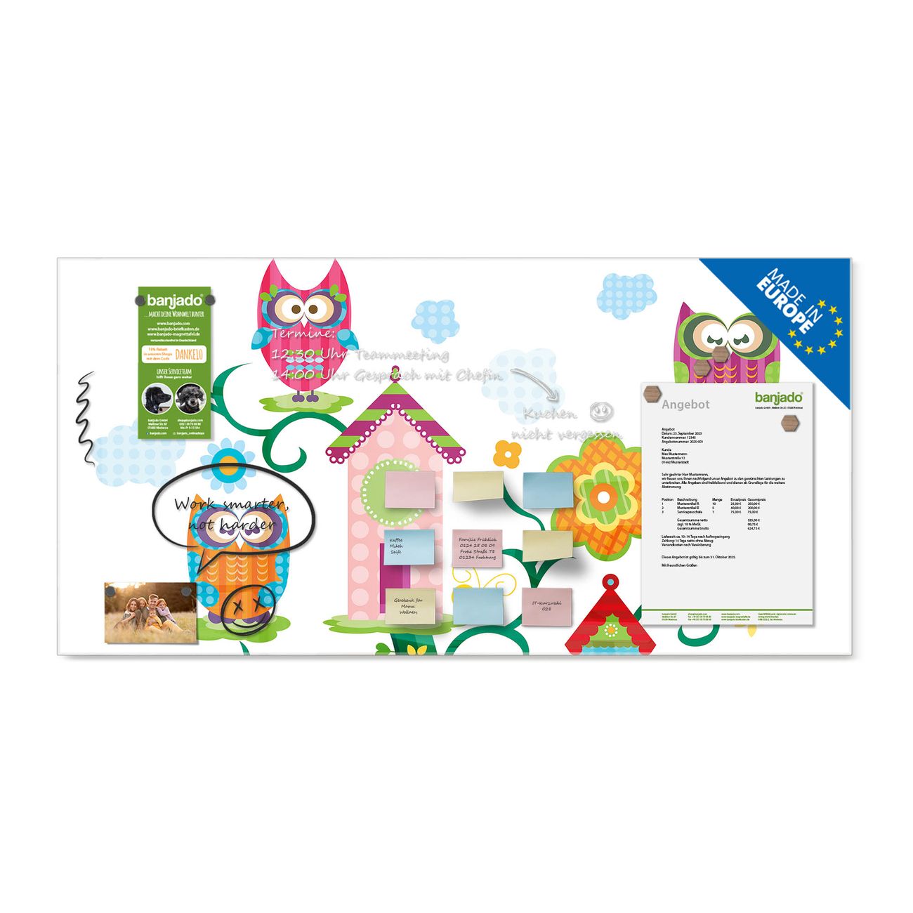 Material: 4mm Sicherheitsglas mit Metallrückwand Eigenschaften: beschreibbar, magnetisch, kratzfest Maße: 100x50x0,6cm, 7,50kg schwer Motiv Nummer 10533 Eulenfamilie Zubehör: inklusive 4 Neodym-Magnete