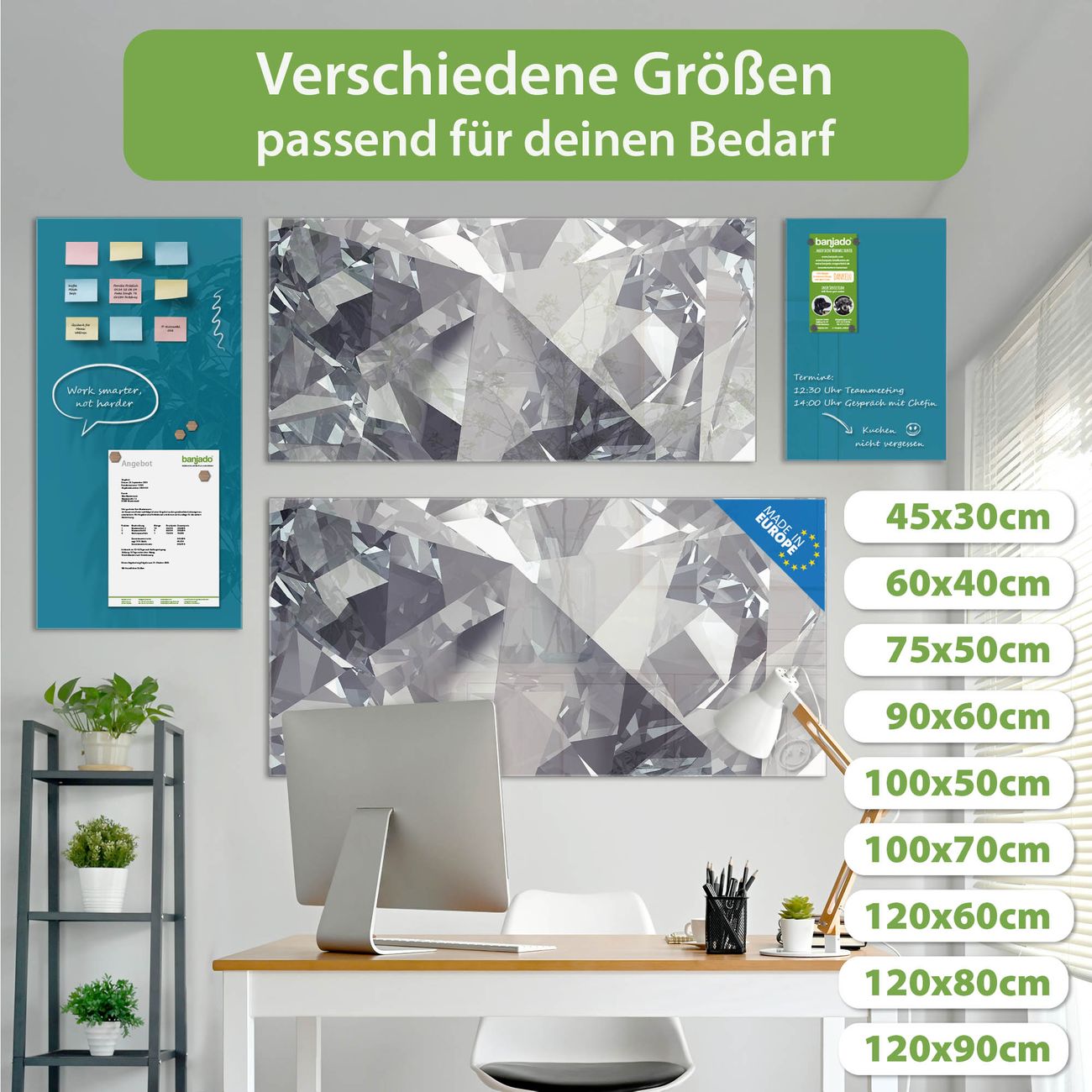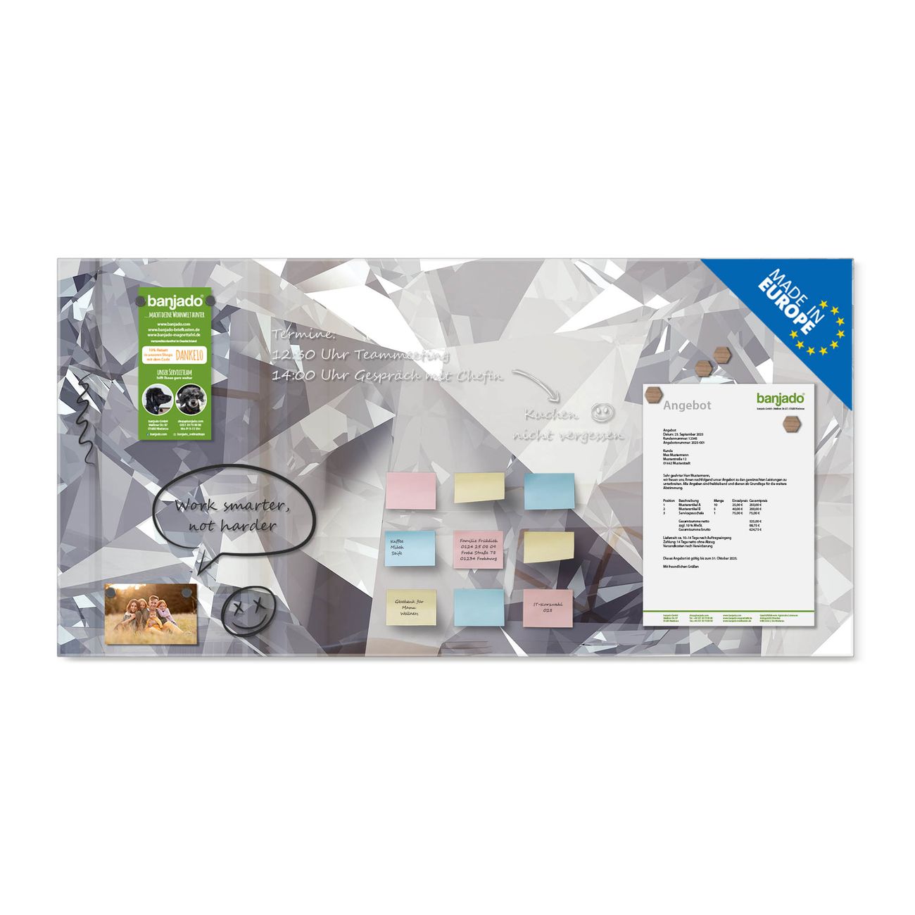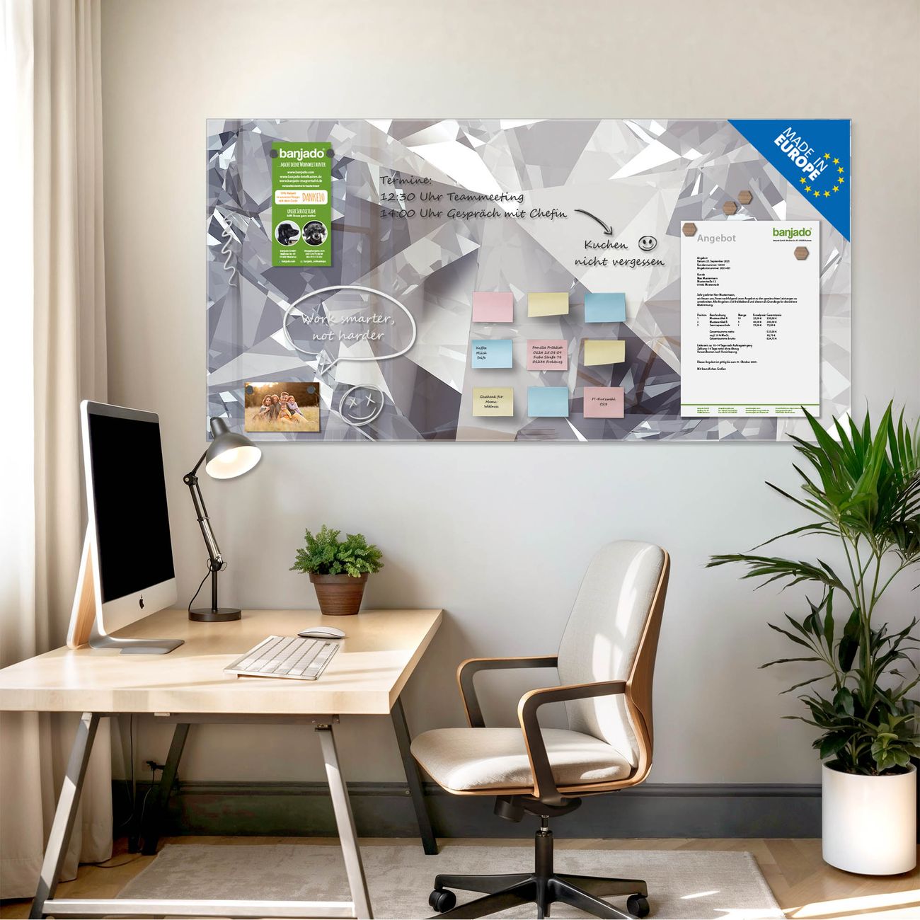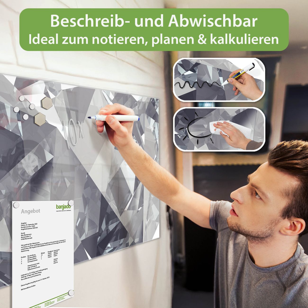 Jede Glas Magnettafel wird in unserer Werkstatt von Hand gefertigt und sorgfältig geprüft. So erhalten Sie ein echtes Qualitätsprodukt, das Funktion und Ästhetik perfekt vereint.?? Warum banjado?