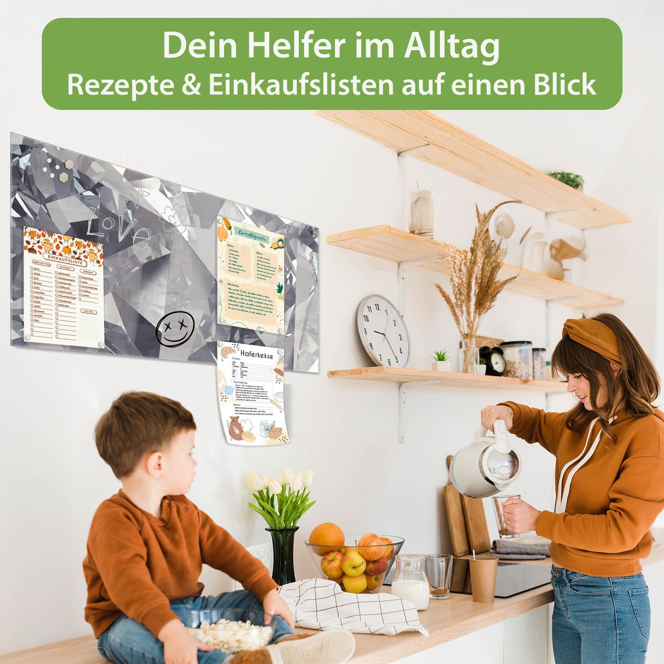 Auf der glatten Glasoberfläche lassen sich Termine, Rezepte oder Notizen ganz einfach mit Kreidestiften festhalten und rückstandslos entfernen. Starke Neodym-Magnete halten Ihre wichtigsten Erinnerungen sicher an Ort und Stelle. So entsteht Ihre ganz persönliche Ideenwand - jeden Tag neu.