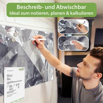 Material: 4mm Sicherheitsglas mit Metallrückwand Eigenschaften: beschreibbar, magnetisch, kratzfest Maße: 100x50x0,6cm, 7,50kg schwer Motiv Nummer 11327 Facetten Monochrome Zubehör: inklusive 4 Neodym-Magnete