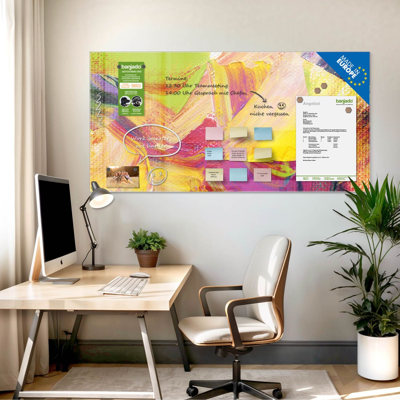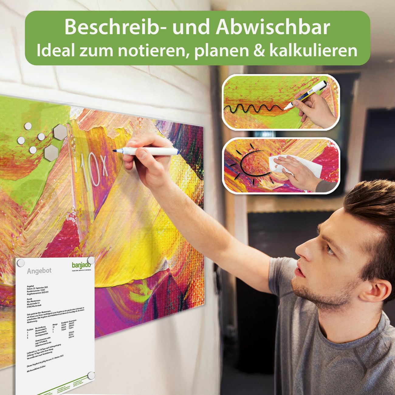 Die banjado Glas Magnettafel mit dem Motiv Motiv Farbe auf Leinwand verbindet Funktionalität mit Stil. Sie ersetzt das Zettelchaos durch klare Strukturen und bringt dabei eine warme, natürliche Atmosphäre in Ihr Zuhause. Ob im Büro, in der Küche oder im Eingangsbereich - dieses Design-Board zieht Blicke an und sorgt für Ordnung mit Charakter.