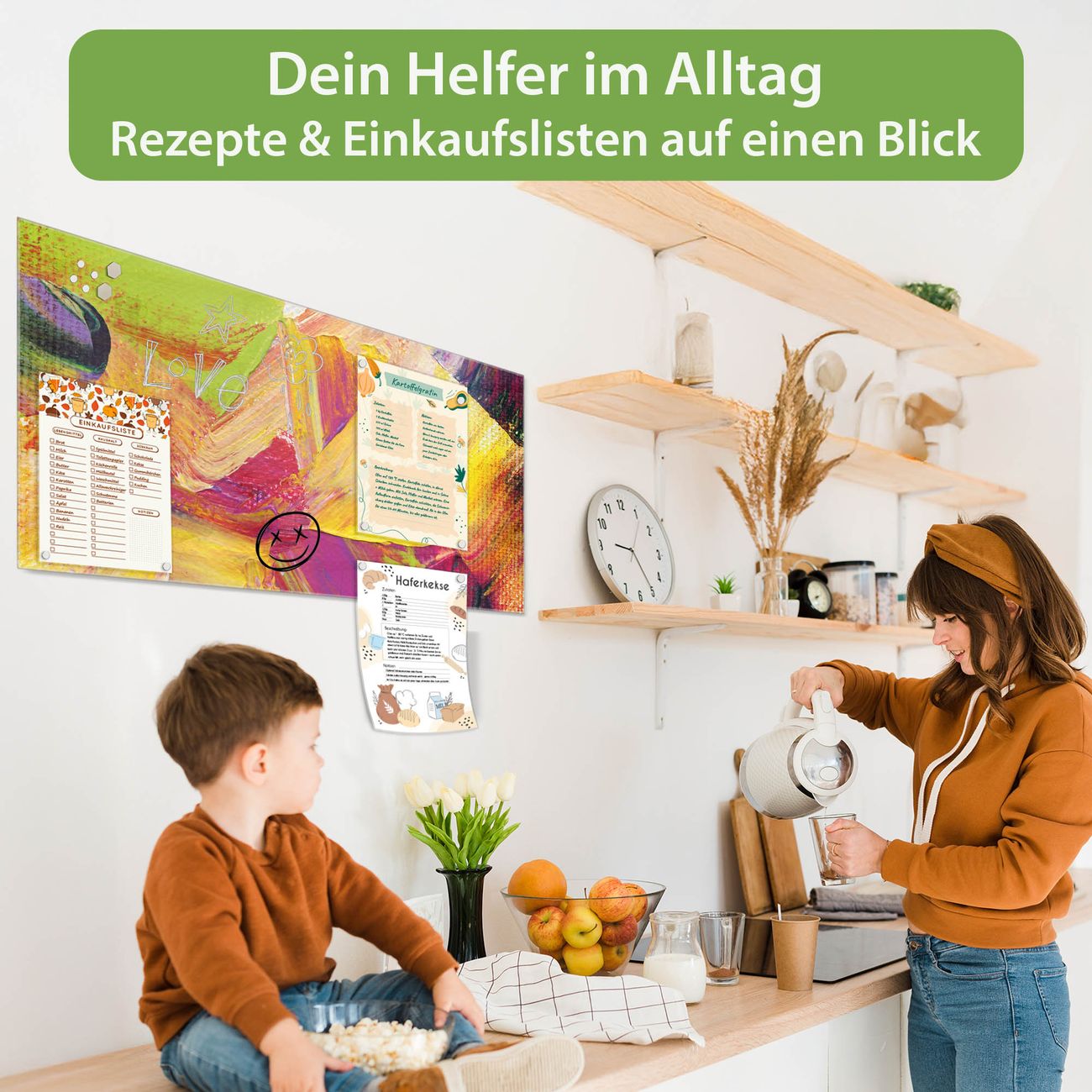 Ein Stück Design, das Ihren Alltag organisiert. Schreiben, heften, inspirieren - alles an einem Ort. Qualität, die man spürt. Montage leicht gemacht. Handwerk mit Herz - veredelt in Sachsen. Einzigartiges Design mit Motiv Motiv Farbe auf Leinwand Beschreibbare Glasoberfläche, leicht zu reinigen Starke Magnetkraft durch Stahlrückwand Inklusive 4 Neodym-Magneten Flexible Montageoptionen Handveredelt in Sachsen - Qualität, die bleibt
