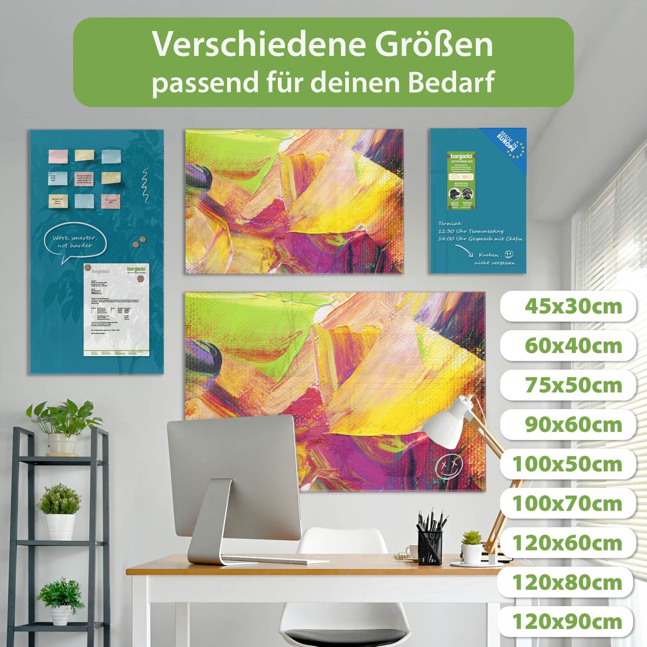 Ein Stück Design, das Ihren Alltag organisiert. Schreiben, heften, inspirieren - alles an einem Ort. Qualität, die man spürt. Montage leicht gemacht. Handwerk mit Herz - veredelt in Sachsen. Einzigartiges Design mit Motiv Motiv Farbe auf Leinwand Beschreibbare Glasoberfläche, leicht zu reinigen Starke Magnetkraft durch Stahlrückwand Inklusive 4 Neodym-Magneten Flexible Montageoptionen Handveredelt in Sachsen - Qualität, die bleibt