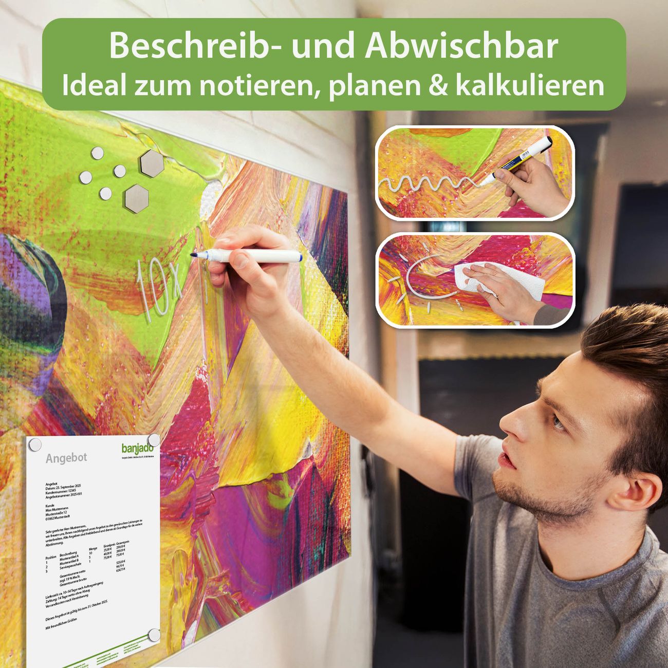 Material: 4mm Sicherheitsglas mit Metallrückwand Eigenschaften: beschreibbar, magnetisch, kratzfest Maße: 75x50x0,6cm, 5,63kg schwer Motiv Nummer 10279 Farbe auf Leinwand Zubehör: inklusive 4 Neodym-Magnete