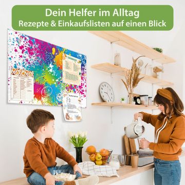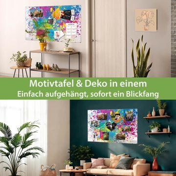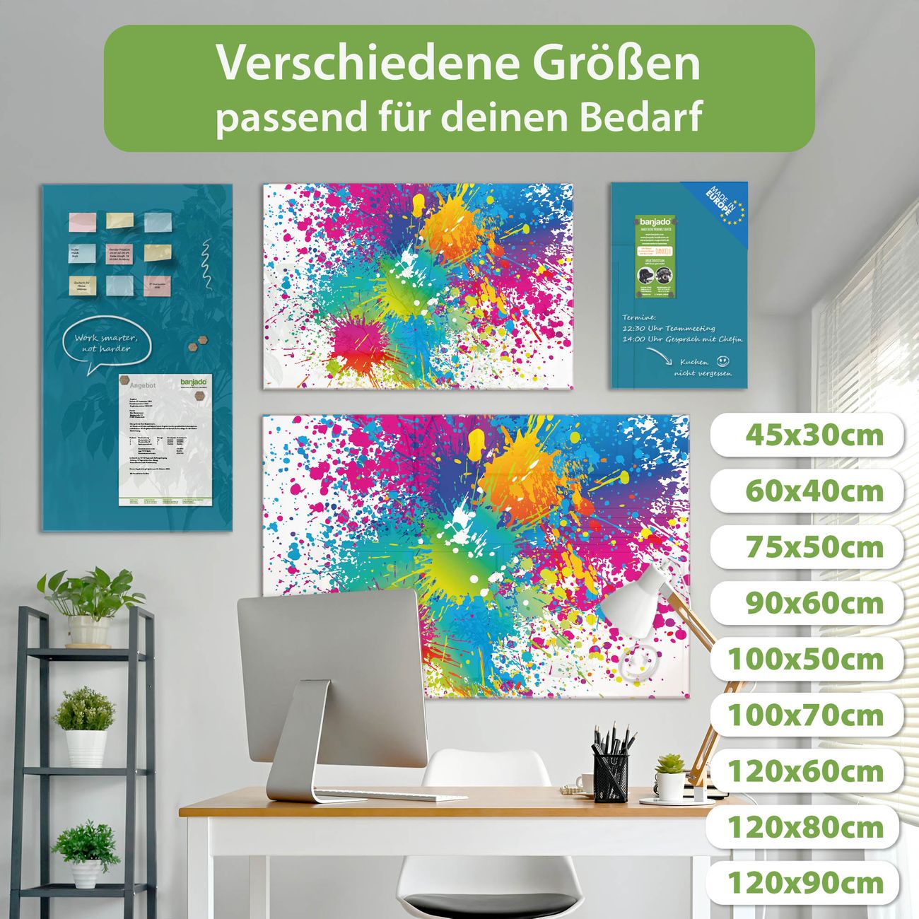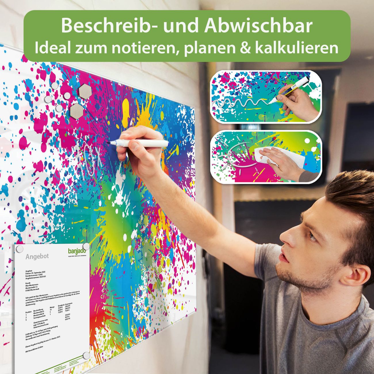 Material: 4mm Sicherheitsglas mit Metallrückwand Eigenschaften: beschreibbar, magnetisch, kratzfest Maße: 75x50x0,6cm, 5,63kg schwer Motiv Nummer 10308 Farbspritzer Zubehör: inklusive 4 Neodym-Magnete