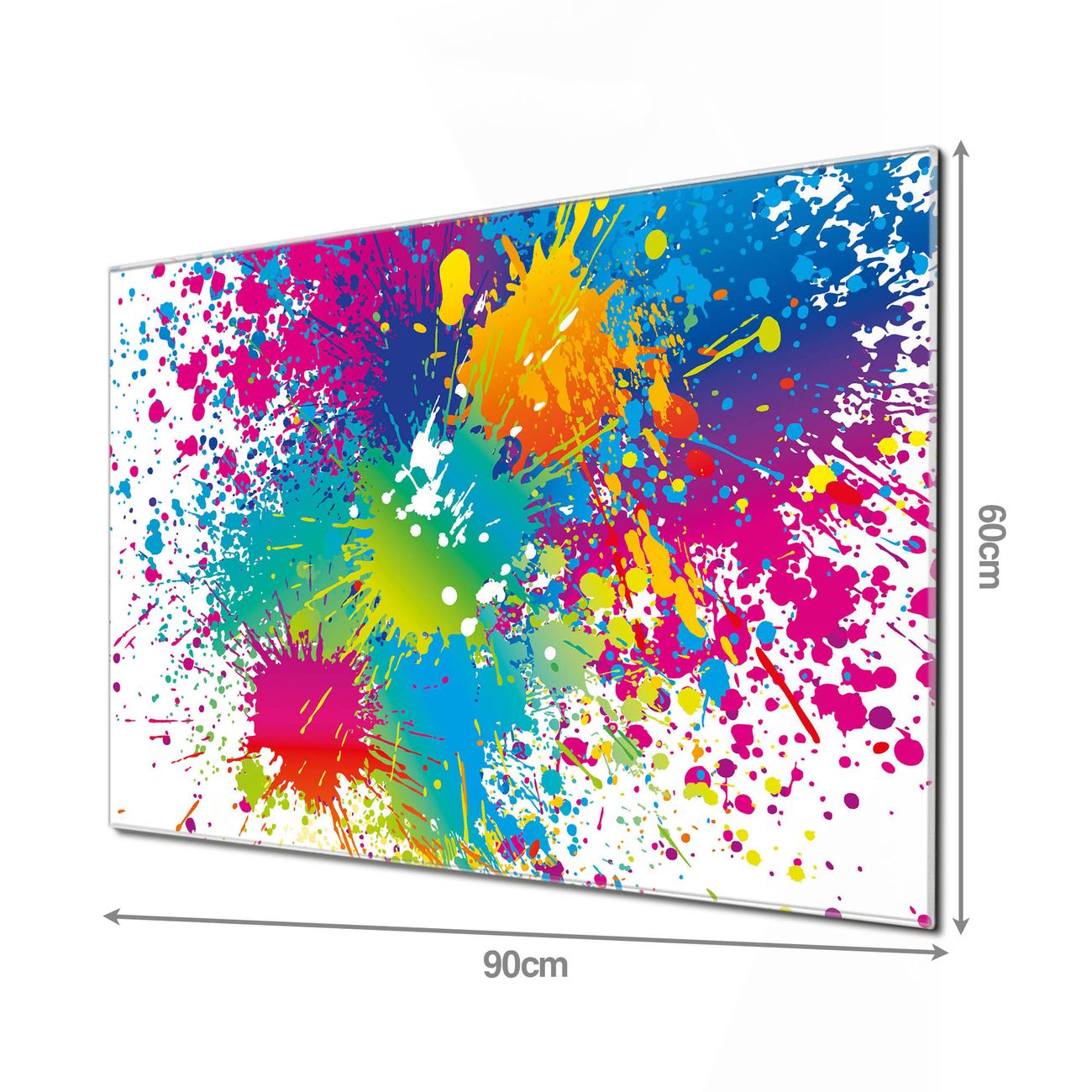Material: 4mm Sicherheitsglas mit Metallrückwand Eigenschaften: beschreibbar, magnetisch, kratzfest Maße: 90x60x0,6cm, 8,10kg schwer Motiv Nummer 10308 Farbspritzer Zubehör: inklusive 4 Neodym-Magnete