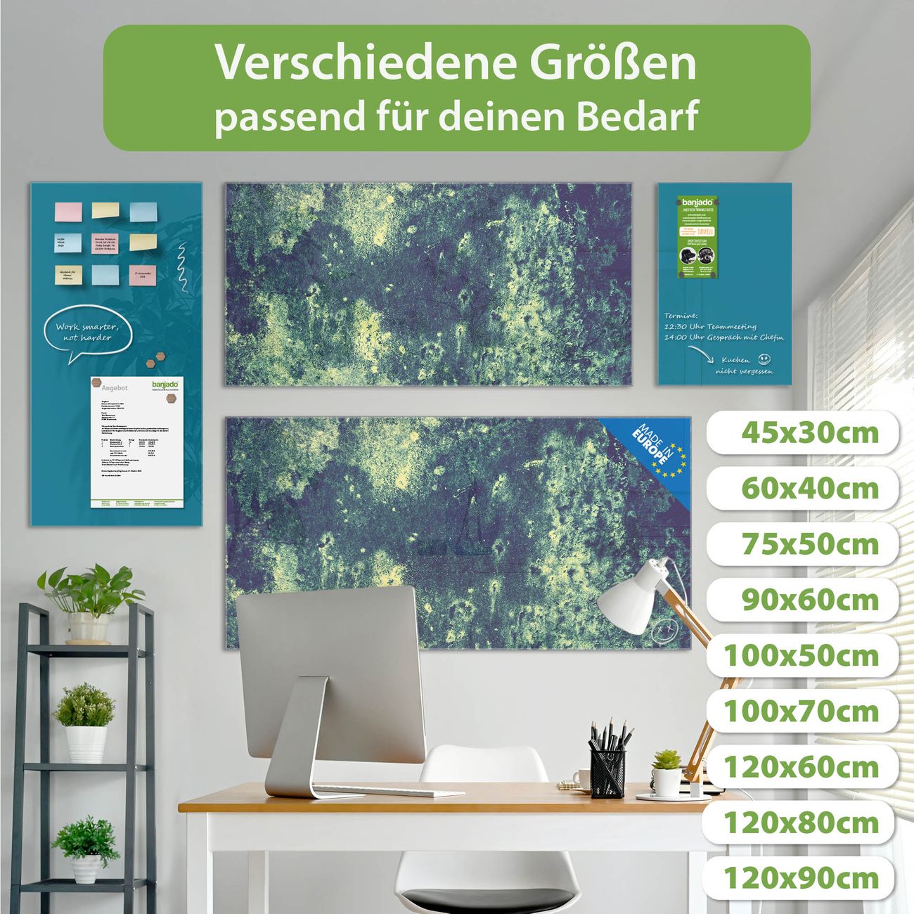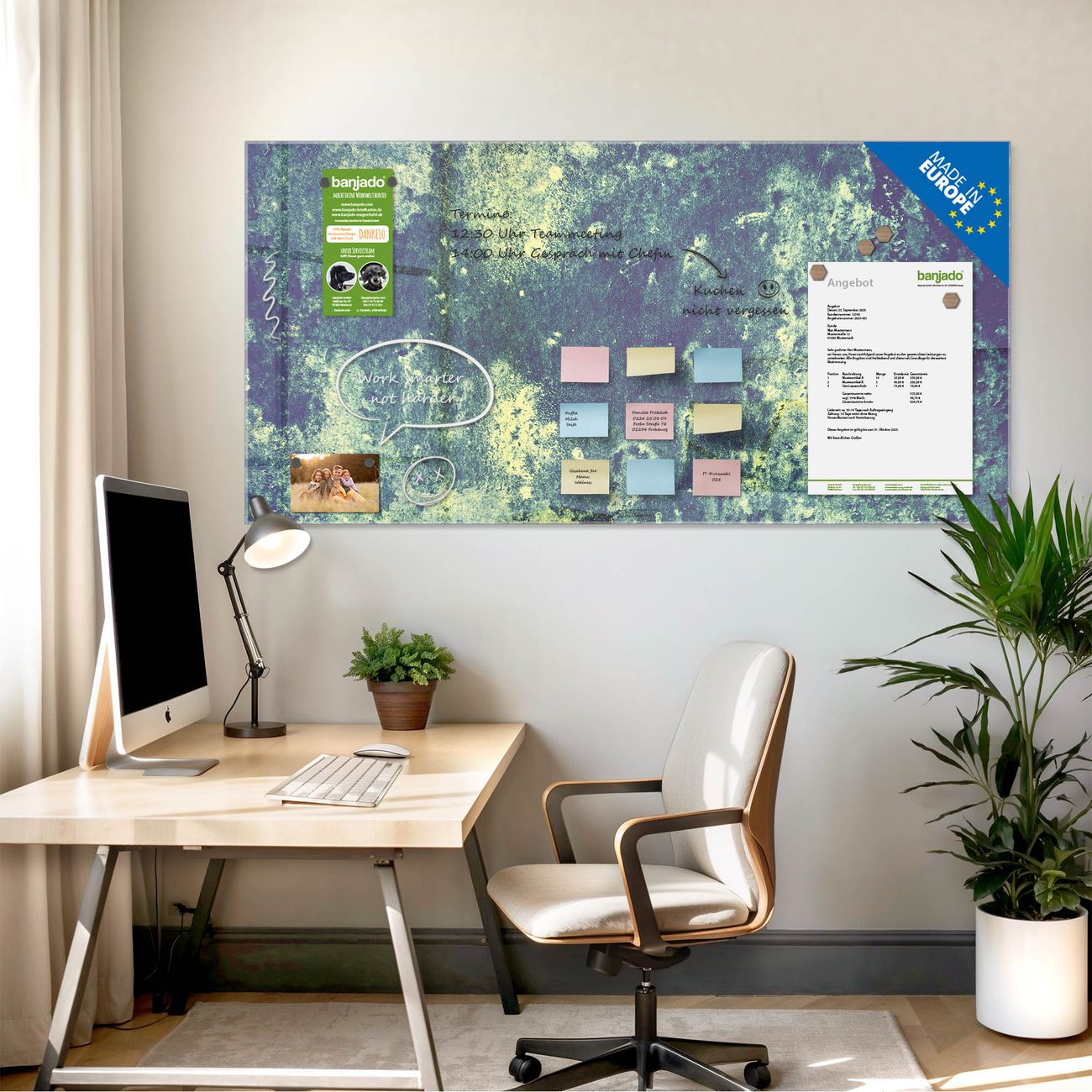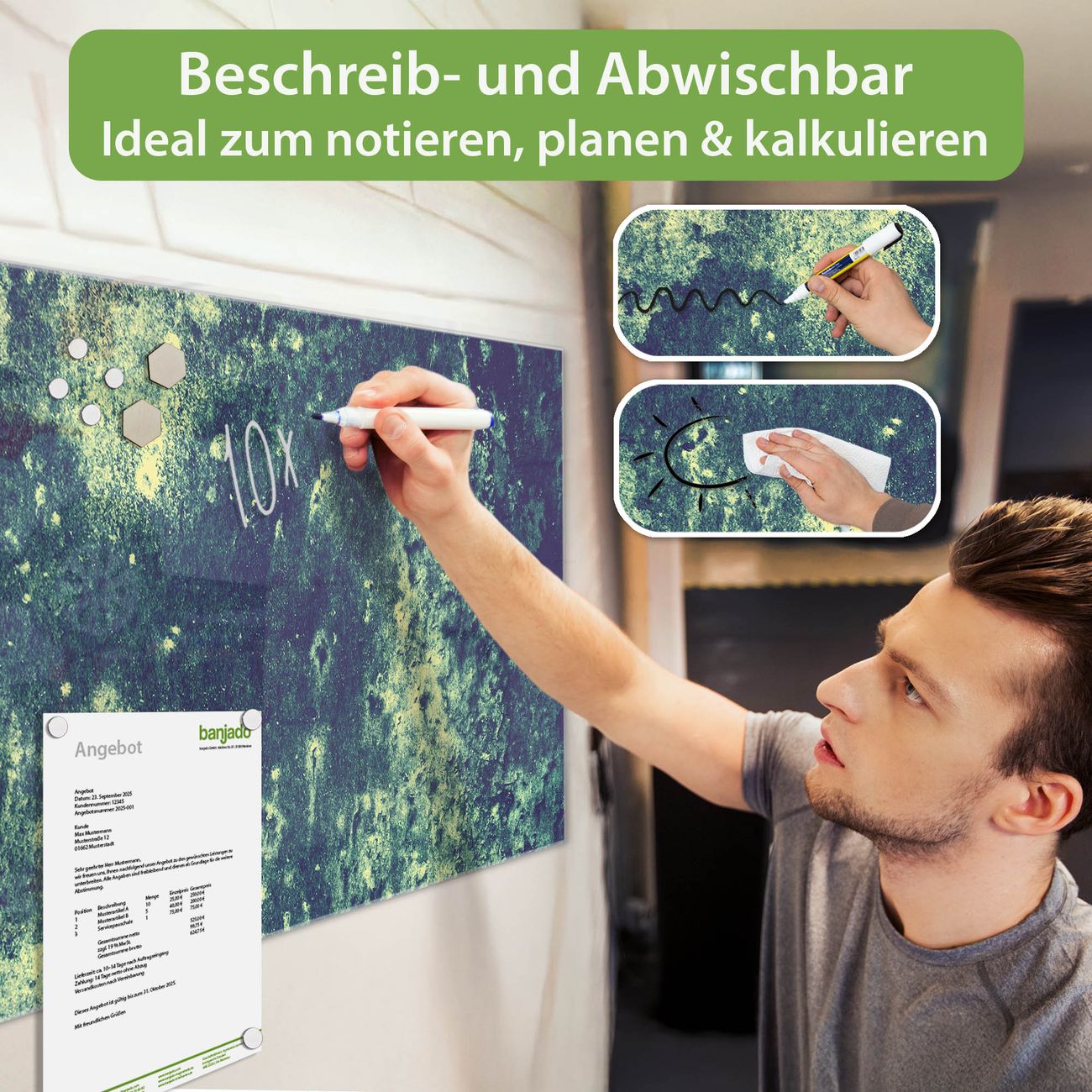 Jede Glas Magnettafel wird in unserer Werkstatt von Hand gefertigt und sorgfältig geprüft. So erhalten Sie ein echtes Qualitätsprodukt, das Funktion und Ästhetik perfekt vereint.?? Warum banjado?
