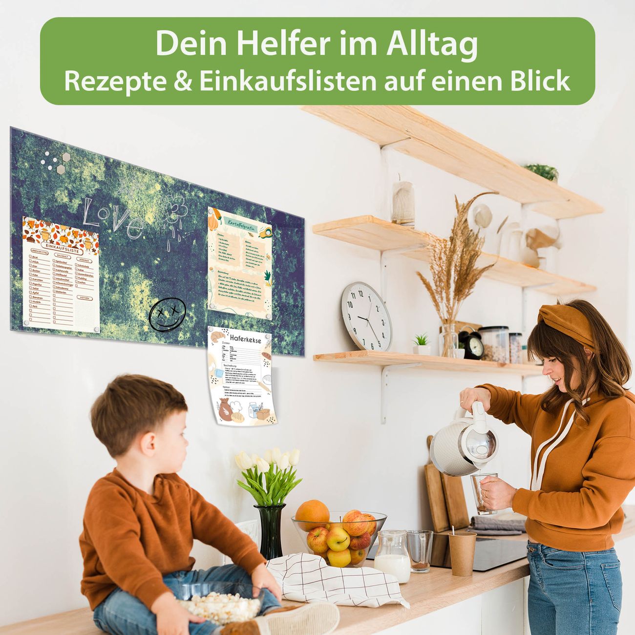 Auf der glatten Glasoberfläche lassen sich Termine, Rezepte oder Notizen ganz einfach mit Kreidestiften festhalten und rückstandslos entfernen. Starke Neodym-Magnete halten Ihre wichtigsten Erinnerungen sicher an Ort und Stelle. So entsteht Ihre ganz persönliche Ideenwand - jeden Tag neu.