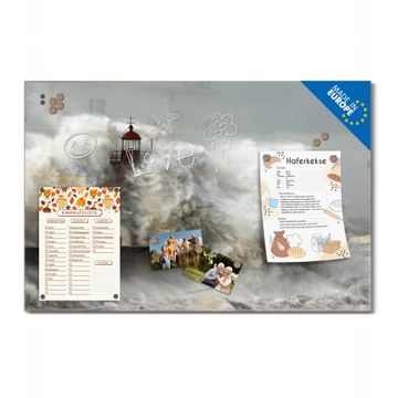 Material: 4mm Sicherheitsglas mit Metallrückwand Eigenschaften: beschreibbar, magnetisch, kratzfest Maße: 45x30x0,6cm, 2,03kg schwer Motiv Nummer 10976 Fels In Der Brandung Zubehör: inklusive 4 Neodym-Magnete