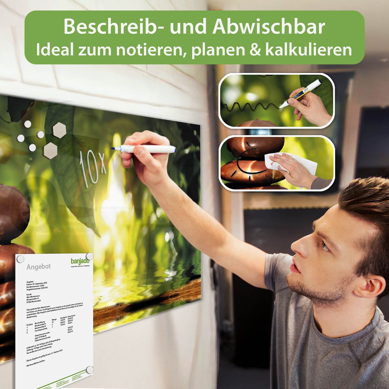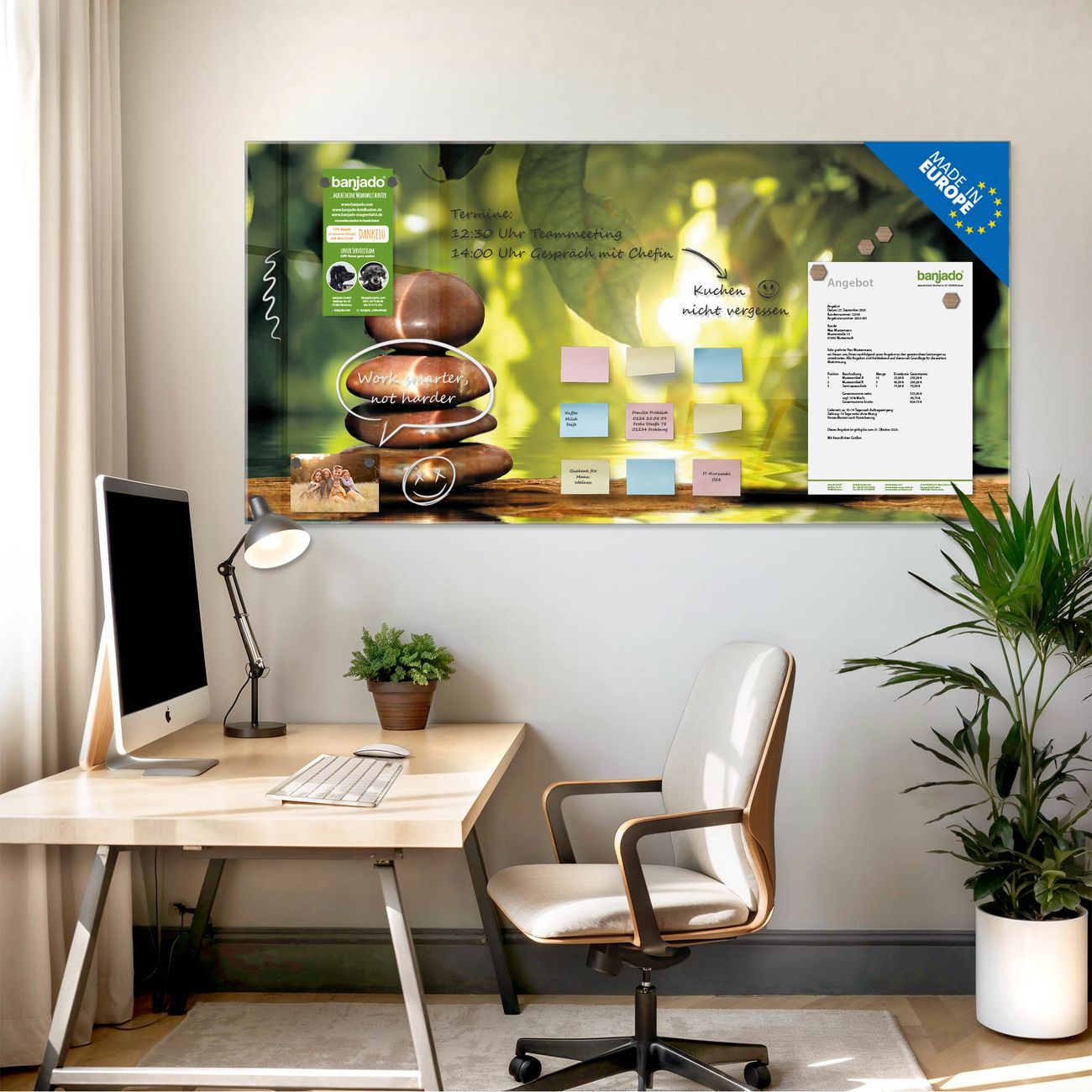Jede Glas Magnettafel wird in unserer Werkstatt von Hand gefertigt und sorgfältig geprüft. So erhalten Sie ein echtes Qualitätsprodukt, das Funktion und Ästhetik perfekt vereint.?? Warum banjado?