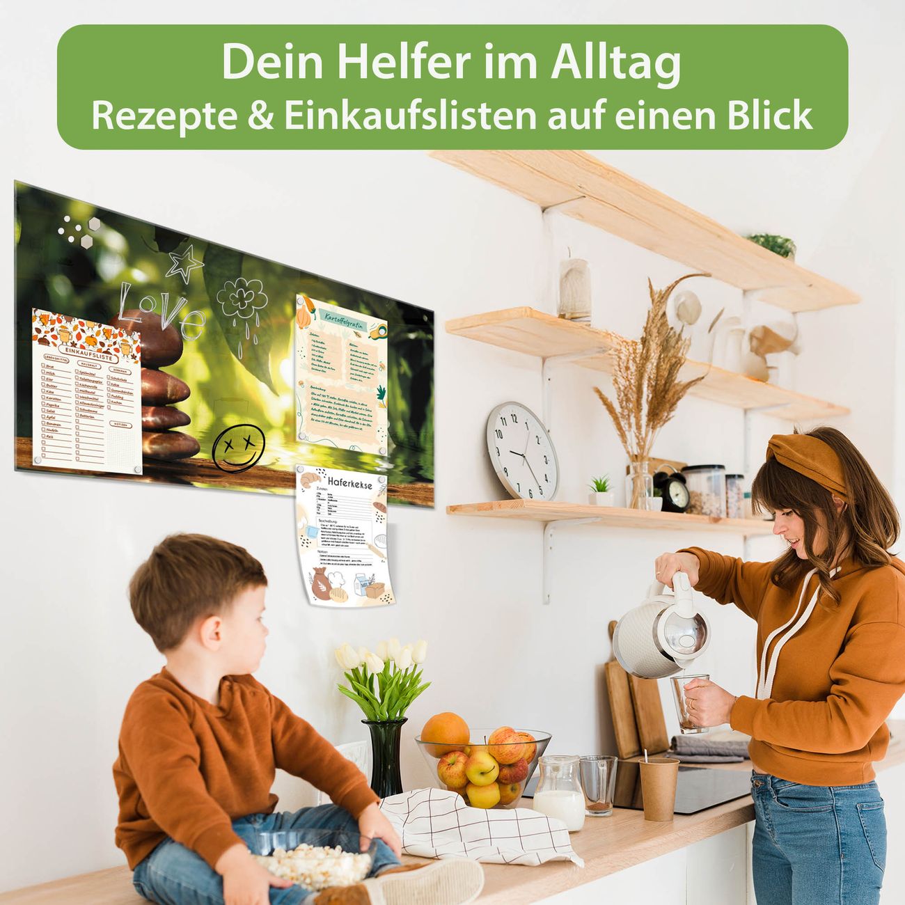 Auf der glatten Glasoberfläche lassen sich Termine, Rezepte oder Notizen ganz einfach mit Kreidestiften festhalten und rückstandslos entfernen. Starke Neodym-Magnete halten Ihre wichtigsten Erinnerungen sicher an Ort und Stelle. So entsteht Ihre ganz persönliche Ideenwand - jeden Tag neu.