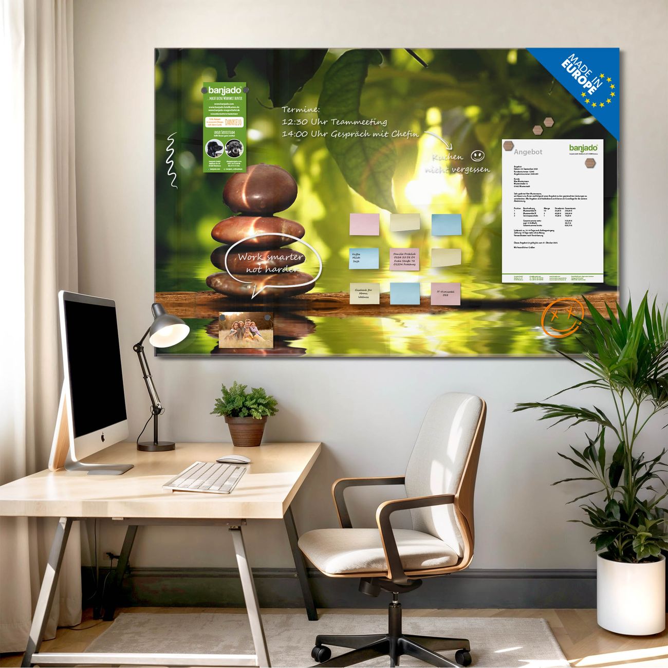 Die banjado Glas Magnettafel mit dem Motiv Motiv Feng Shui verbindet Funktionalität mit Stil. Sie ersetzt das Zettelchaos durch klare Strukturen und bringt dabei eine warme, natürliche Atmosphäre in Ihr Zuhause. Ob im Büro, in der Küche oder im Eingangsbereich - dieses Design-Board zieht Blicke an und sorgt für Ordnung mit Charakter.