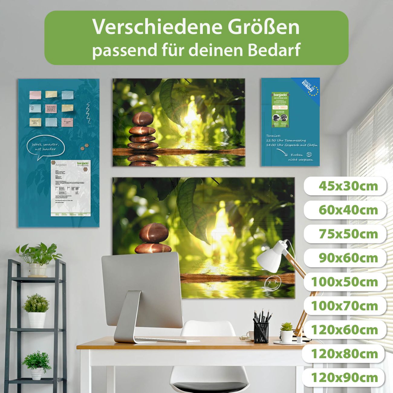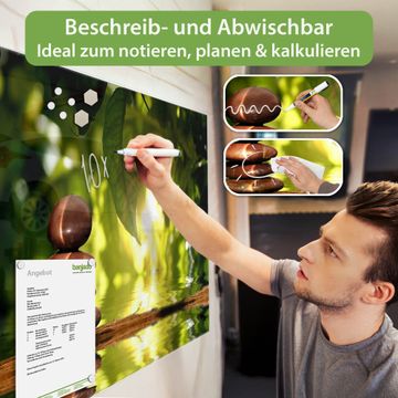 Material: 4mm Sicherheitsglas mit Metallrückwand Eigenschaften: beschreibbar, magnetisch, kratzfest Maße: 120x80x0,6cm, 14,40kg schwer Motiv Nummer 10138 Feng Shui Zubehör: inklusive 4 Neodym-Magnete