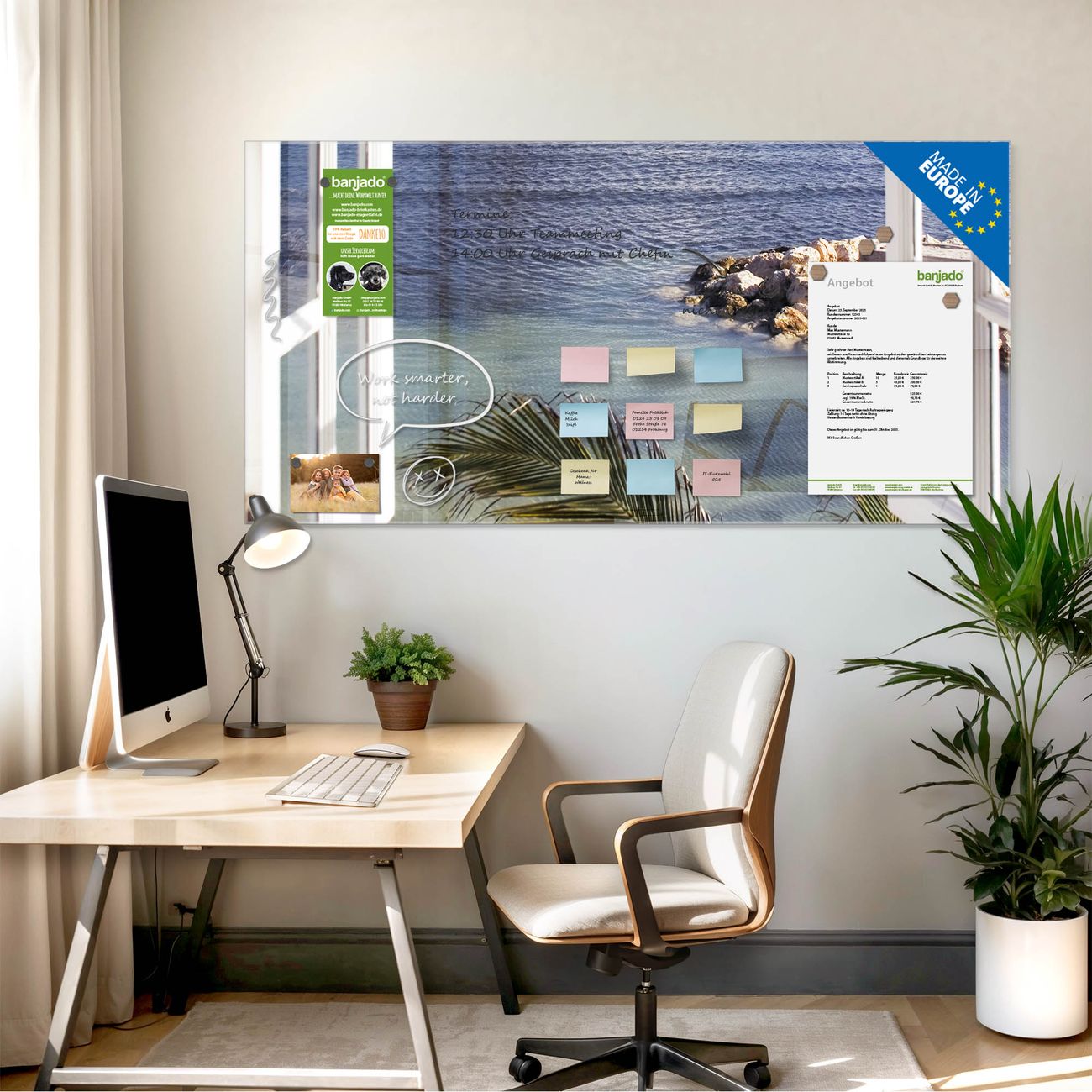 Die banjado Glas Magnettafel mit dem Motiv Motiv Fensterpanorama verbindet Funktionalität mit Stil. Sie ersetzt das Zettelchaos durch klare Strukturen und bringt dabei eine warme, natürliche Atmosphäre in Ihr Zuhause. Ob im Büro, in der Küche oder im Eingangsbereich - dieses Design-Board zieht Blicke an und sorgt für Ordnung mit Charakter.