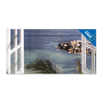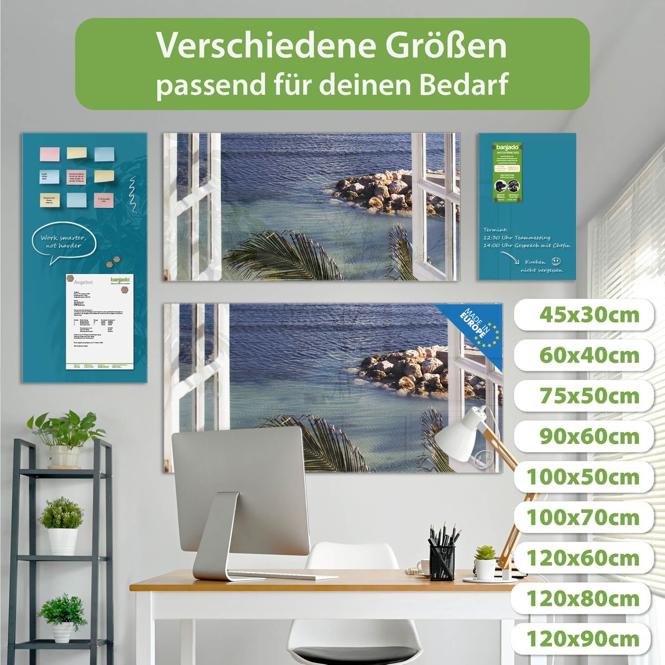 Material: 4mm Sicherheitsglas mit Metallrückwand Eigenschaften: beschreibbar, magnetisch, kratzfest Maße: 120x60x0,6cm, 10,80kg schwer Motiv Nummer 10122 Fensterpanorama Zubehör: inklusive 4 Neodym-Magnete