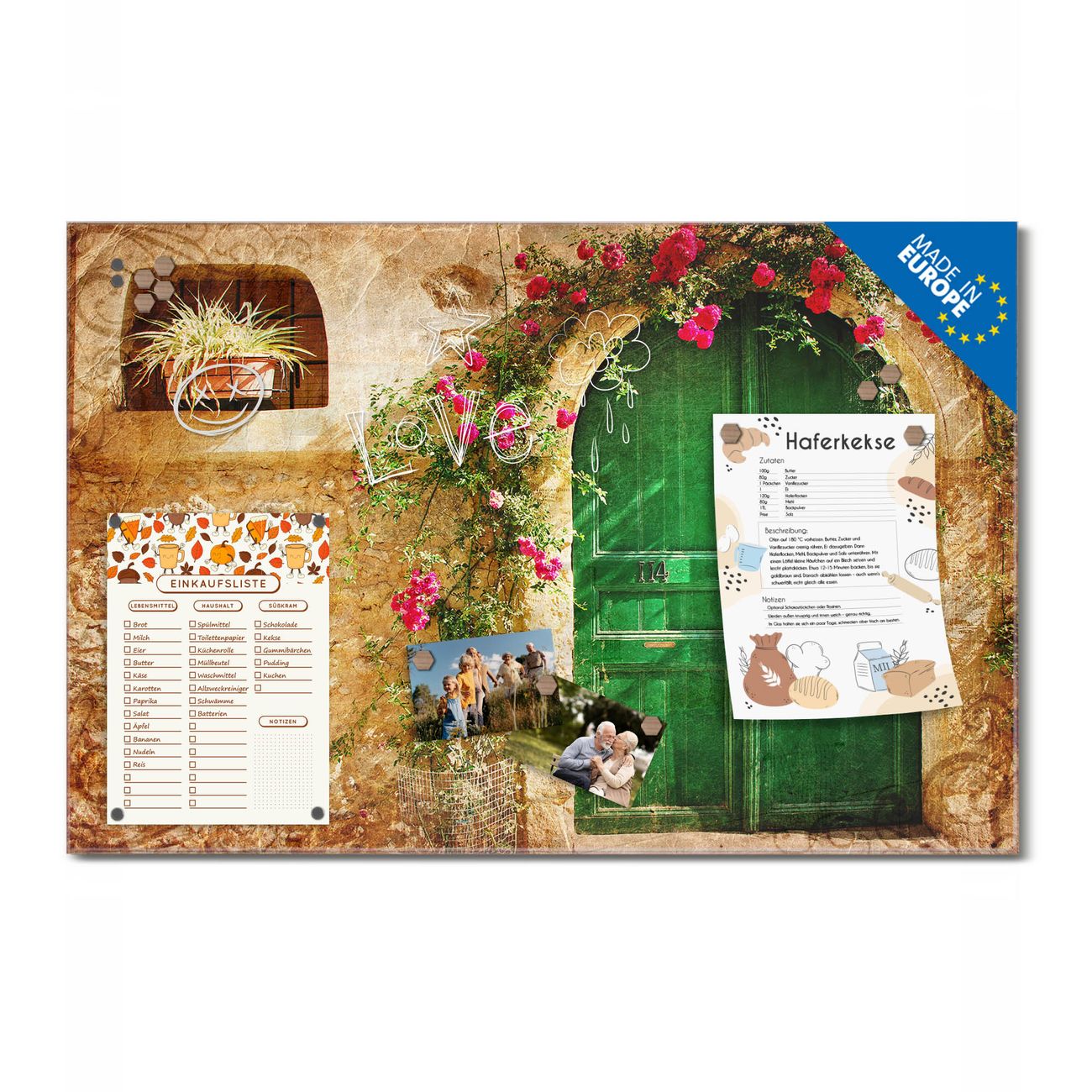 Material: 4mm Sicherheitsglas mit Metallrückwand Eigenschaften: beschreibbar, magnetisch, kratzfest Maße: 75x50x0,6cm, 5,63kg schwer Motiv Nummer 10280 Ferienhaus Zubehör: inklusive 4 Neodym-Magnete