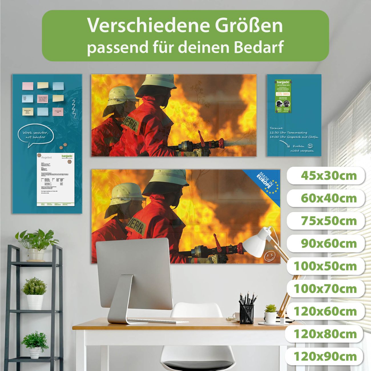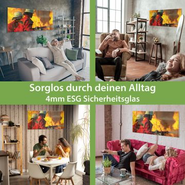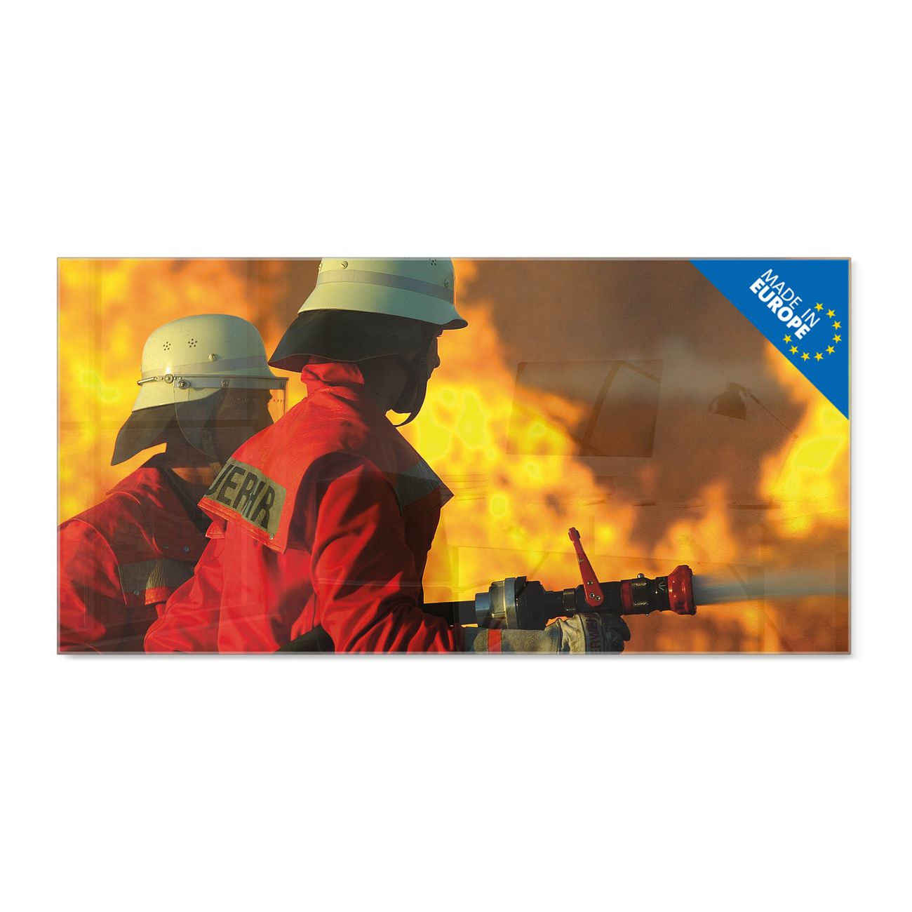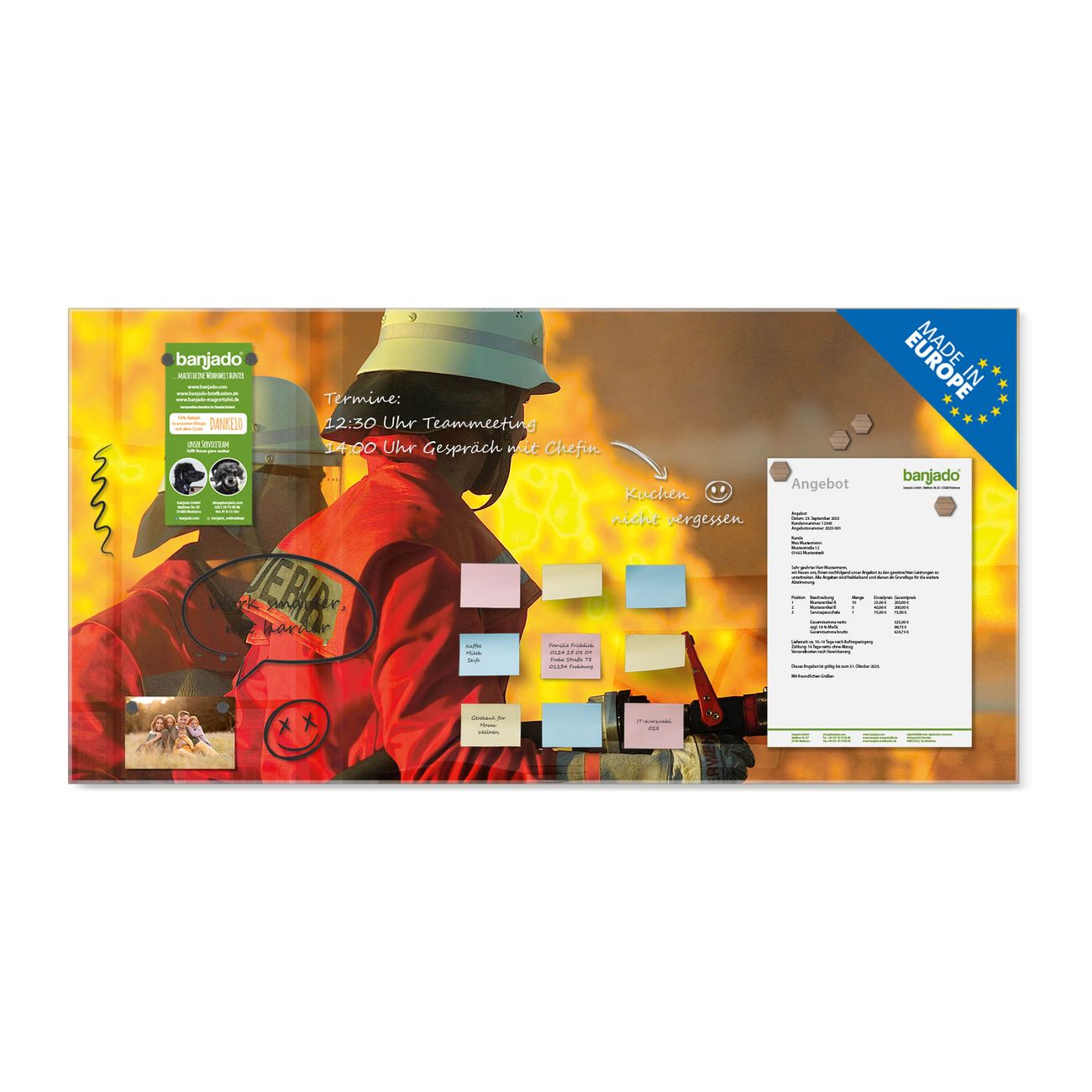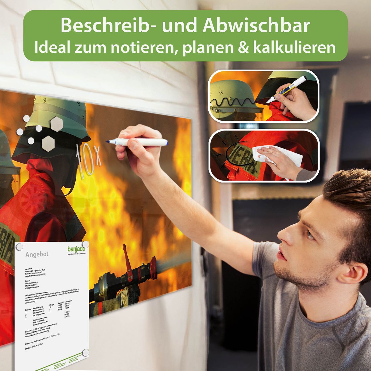 Material: 4mm Sicherheitsglas mit Metallrückwand Eigenschaften: beschreibbar, magnetisch, kratzfest Maße: 110x55x0,6cm, 9,08kg schwer Motiv Nummer 10168 Feuer Zubehör: inklusive 4 Neodym-Magnete