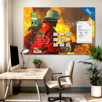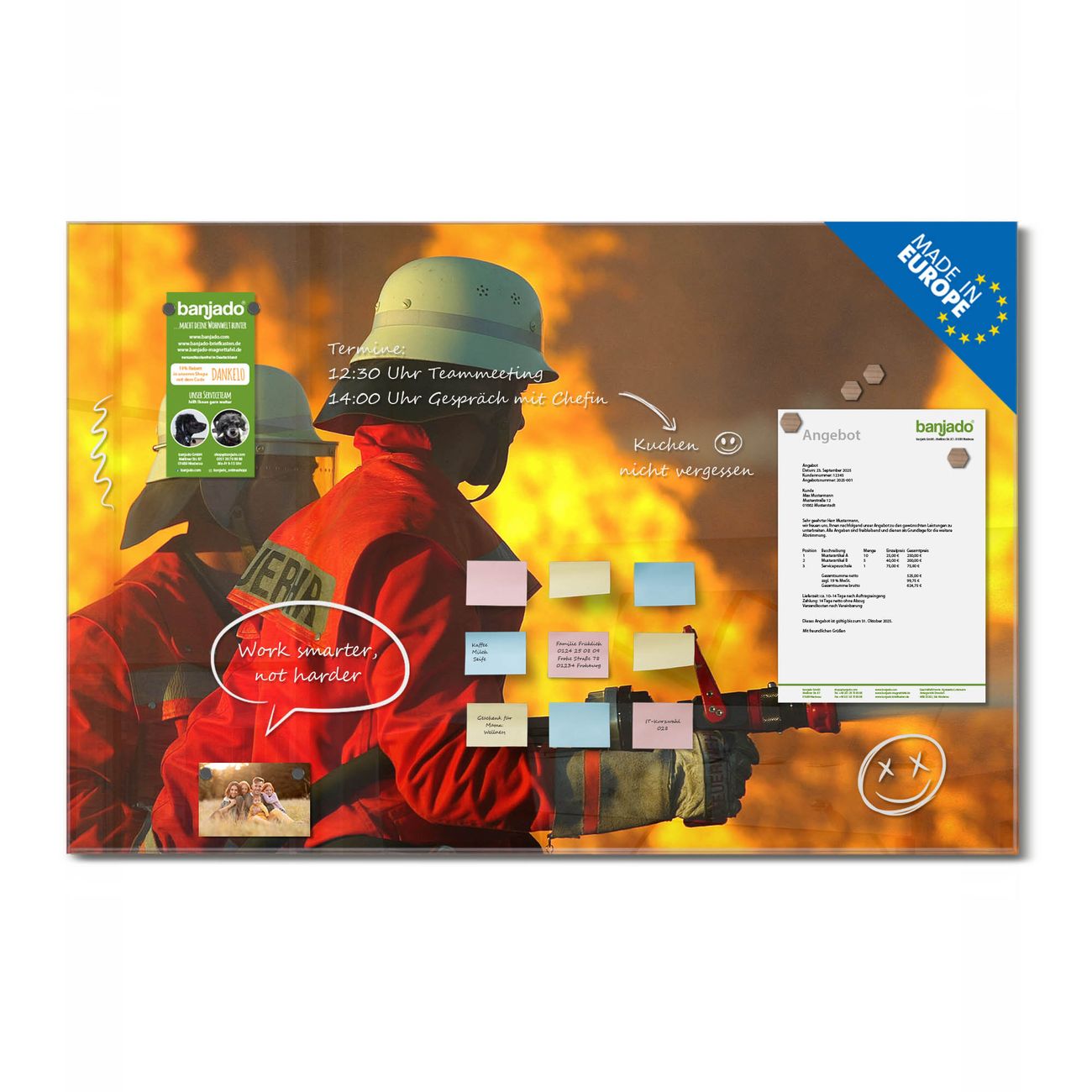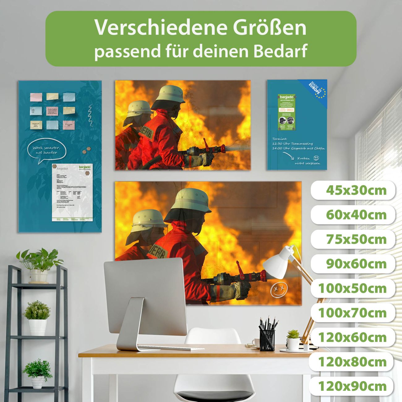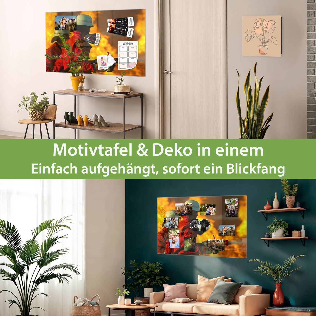 Material: 4mm Sicherheitsglas mit Metallrückwand Eigenschaften: beschreibbar, magnetisch, kratzfest Maße: 120x80x0,6cm, 14,40kg schwer Motiv Nummer 10168 Feuer Zubehör: inklusive 4 Neodym-Magnete