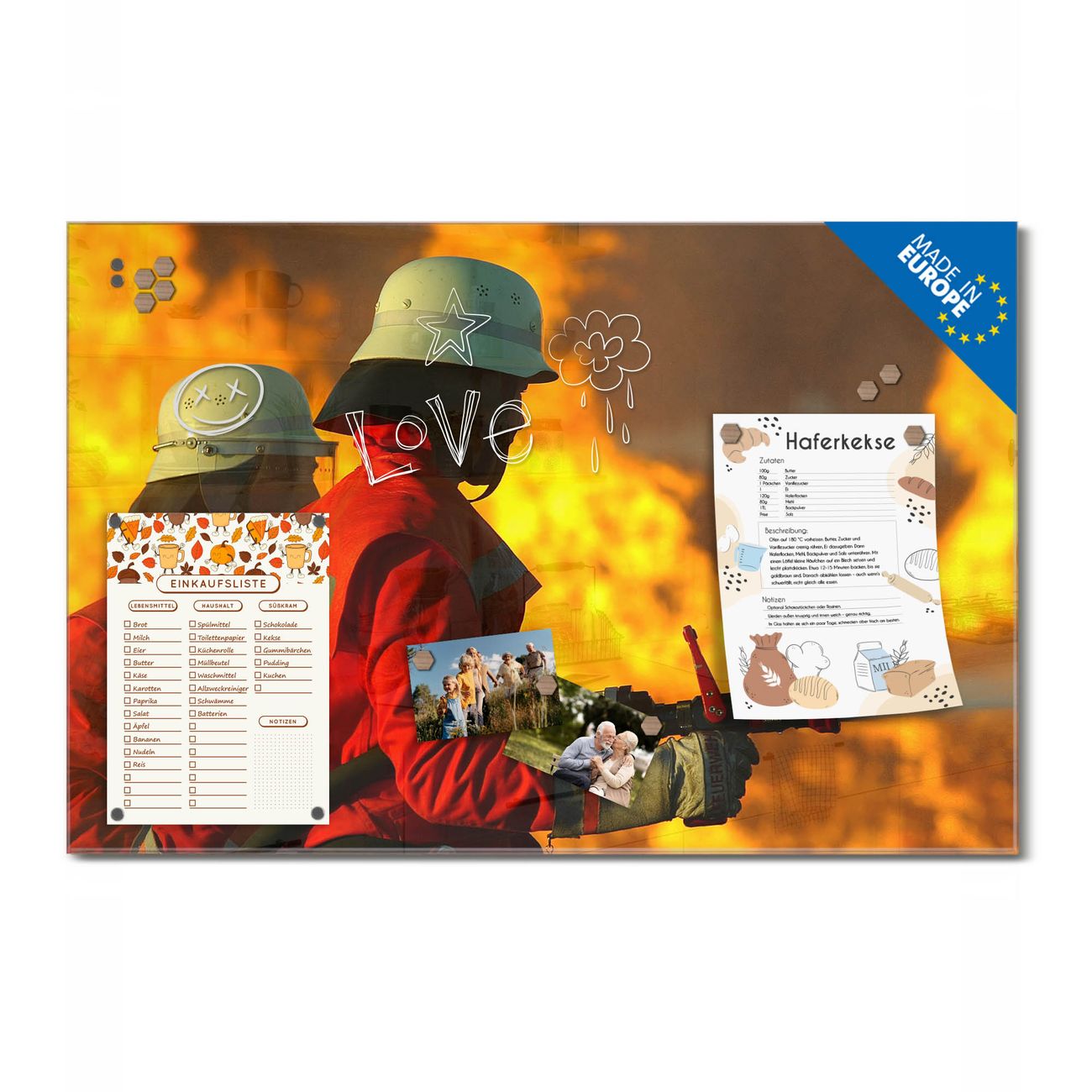 Material: 4mm Sicherheitsglas mit Metallrückwand Eigenschaften: beschreibbar, magnetisch, kratzfest Maße: 75x50x0,6cm, 5,63kg schwer Motiv Nummer 10168 Feuer Zubehör: inklusive 4 Neodym-Magnete