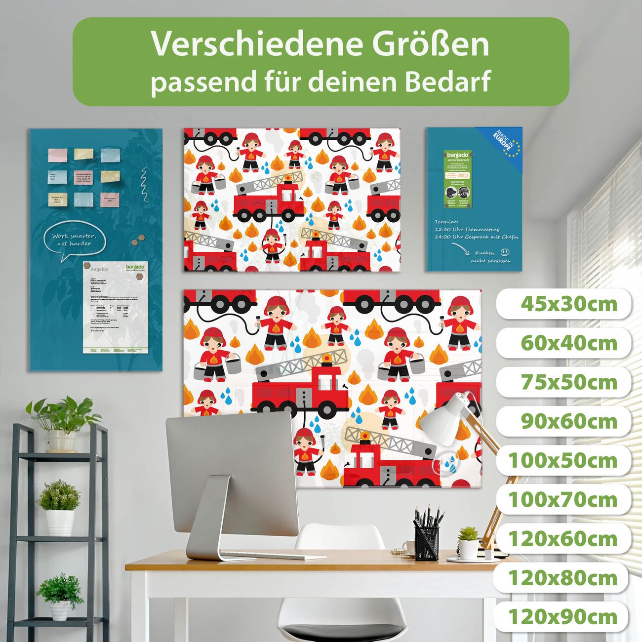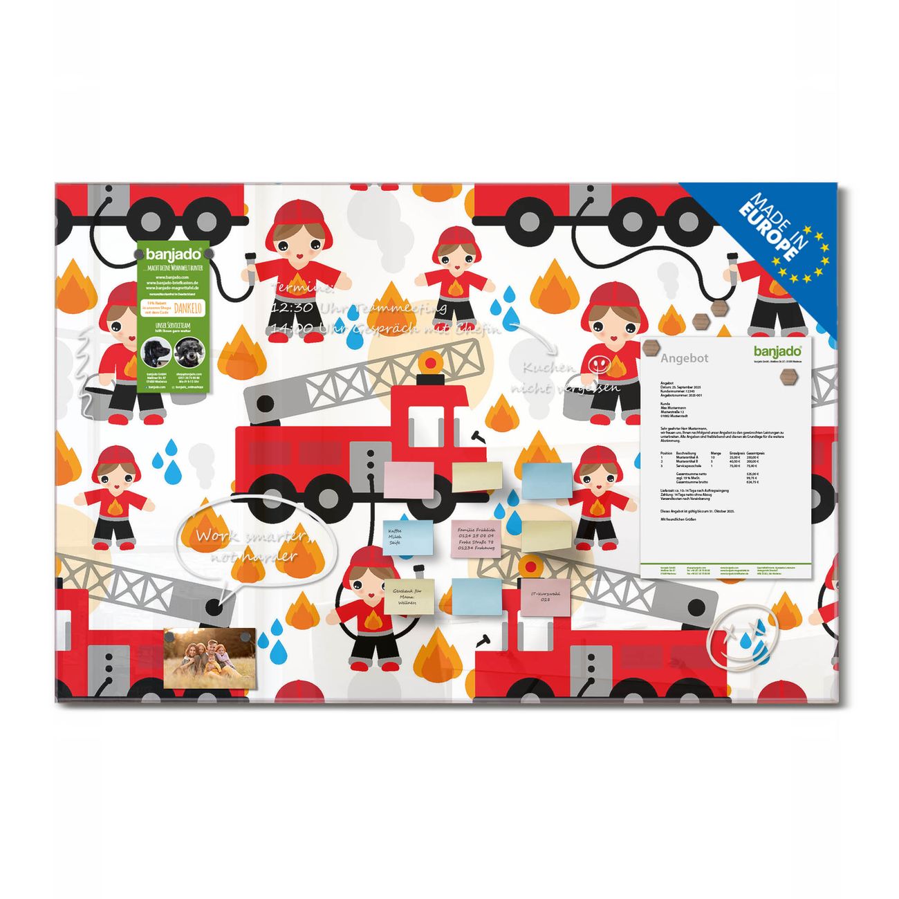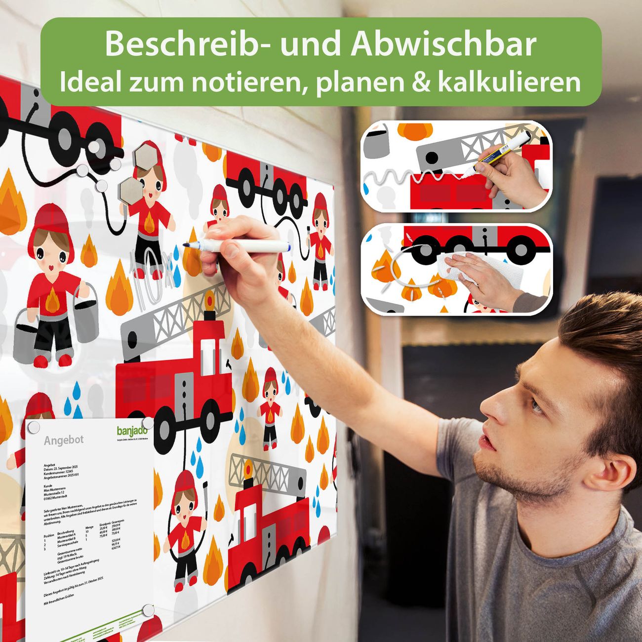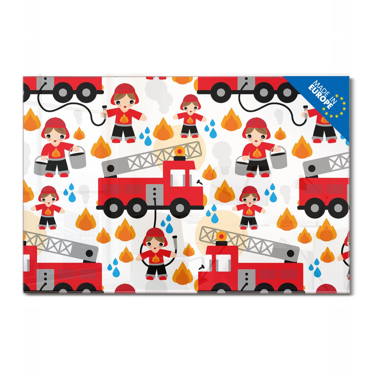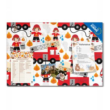 Material: 4mm Sicherheitsglas mit Metallrückwand Eigenschaften: beschreibbar, magnetisch, kratzfest Maße: 110x55x0,6cm, 9,08kg schwer Motiv Nummer 11371 Feuerwehr Zubehör: inklusive 4 Neodym-Magnete
