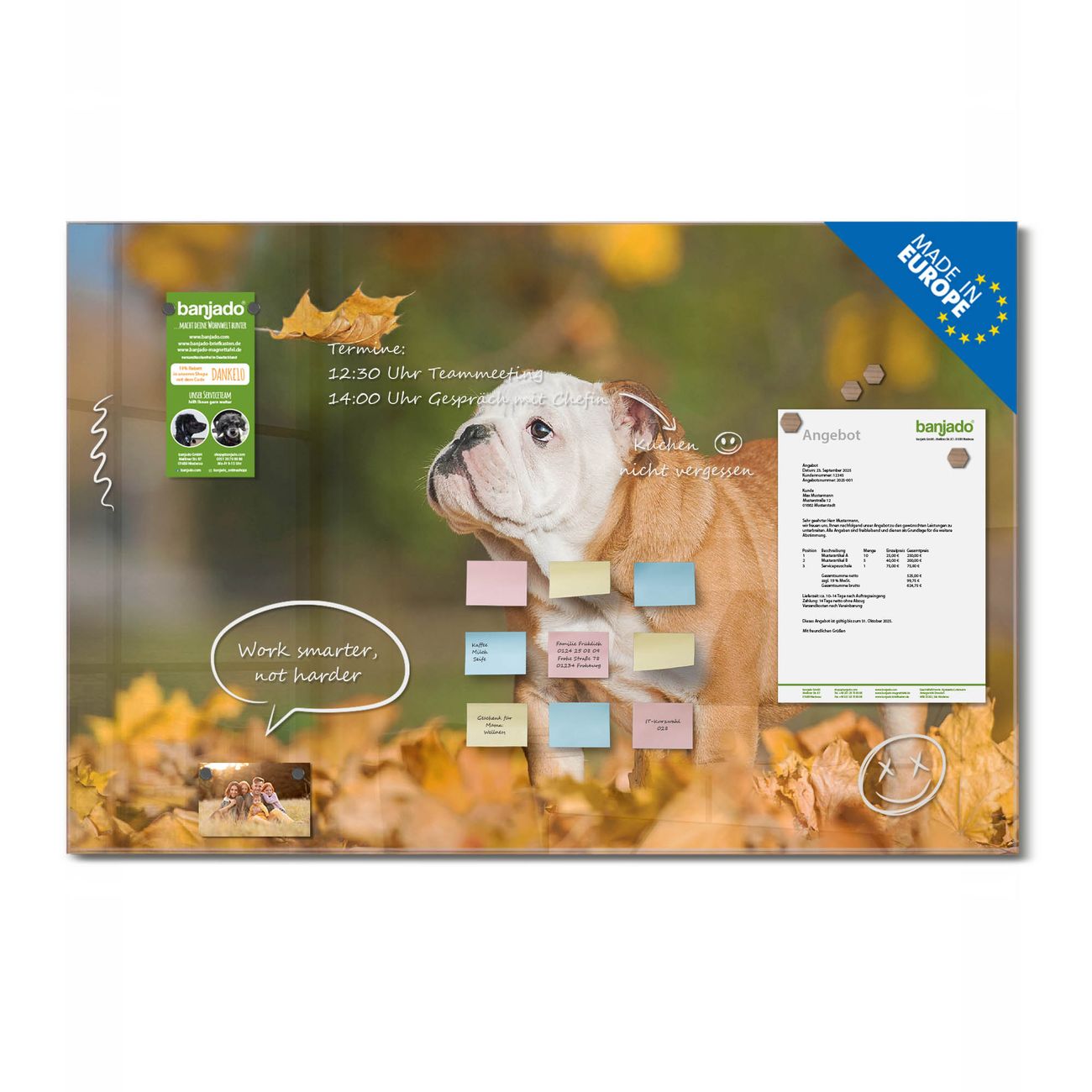 Jede Glas Magnettafel wird in unserer Werkstatt von Hand gefertigt und sorgfältig geprüft. So erhalten Sie ein echtes Qualitätsprodukt, das Funktion und Ästhetik perfekt vereint.?? Warum banjado?