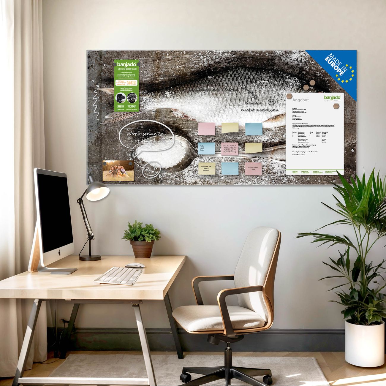 Die banjado Glas Magnettafel mit dem Motiv Motiv Fisch Und Salz verbindet Funktionalität mit Stil. Sie ersetzt das Zettelchaos durch klare Strukturen und bringt dabei eine warme, natürliche Atmosphäre in Ihr Zuhause. Ob im Büro, in der Küche oder im Eingangsbereich - dieses Design-Board zieht Blicke an und sorgt für Ordnung mit Charakter.
