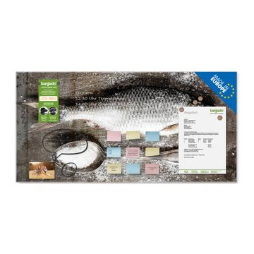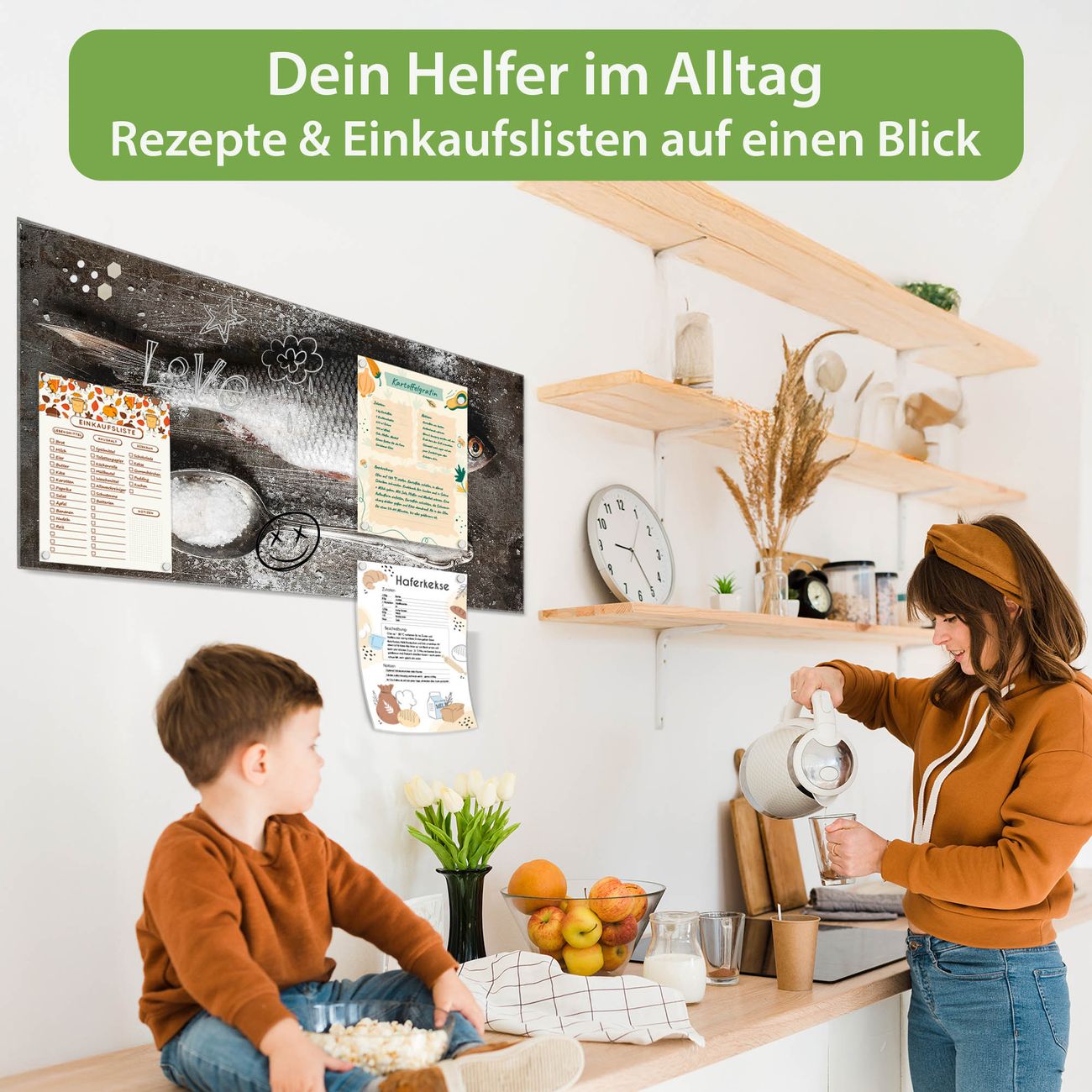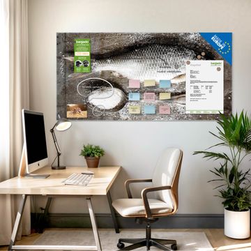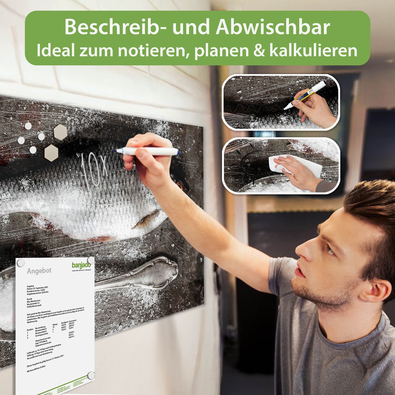 Material: 4mm Sicherheitsglas mit Metallrückwand Eigenschaften: beschreibbar, magnetisch, kratzfest Maße: 110x55x0,6cm, 9,08kg schwer Motiv Nummer 12702 Fisch Und Salz Zubehör: inklusive 4 Neodym-Magnete