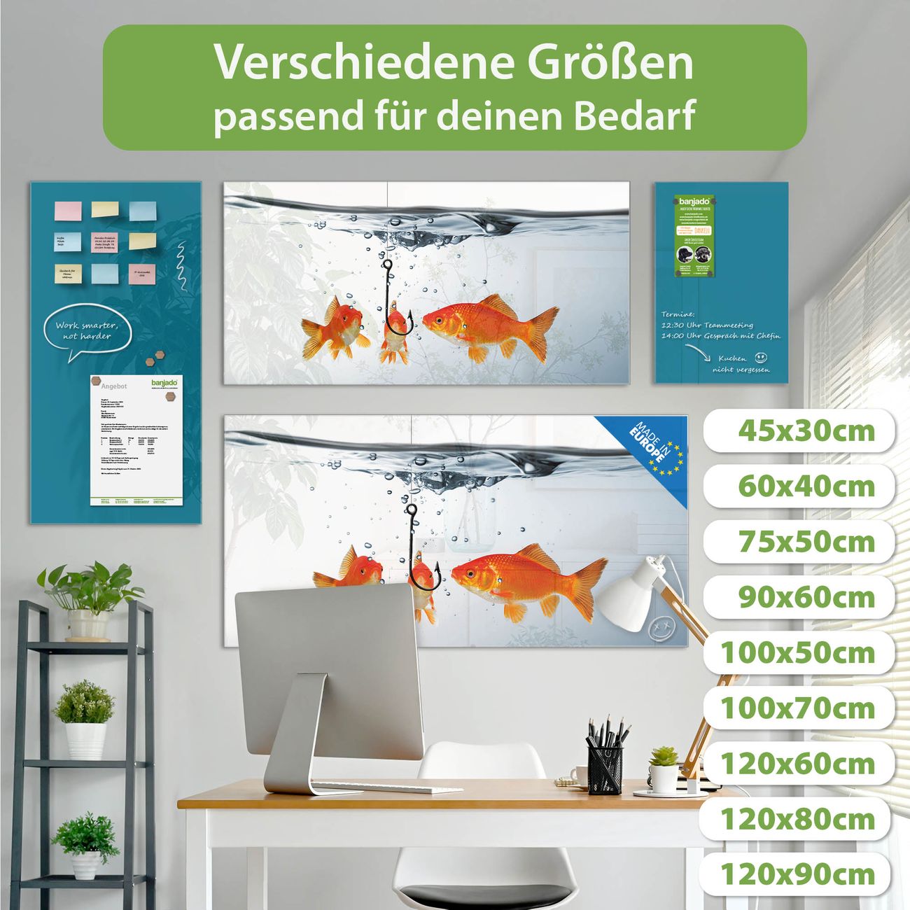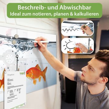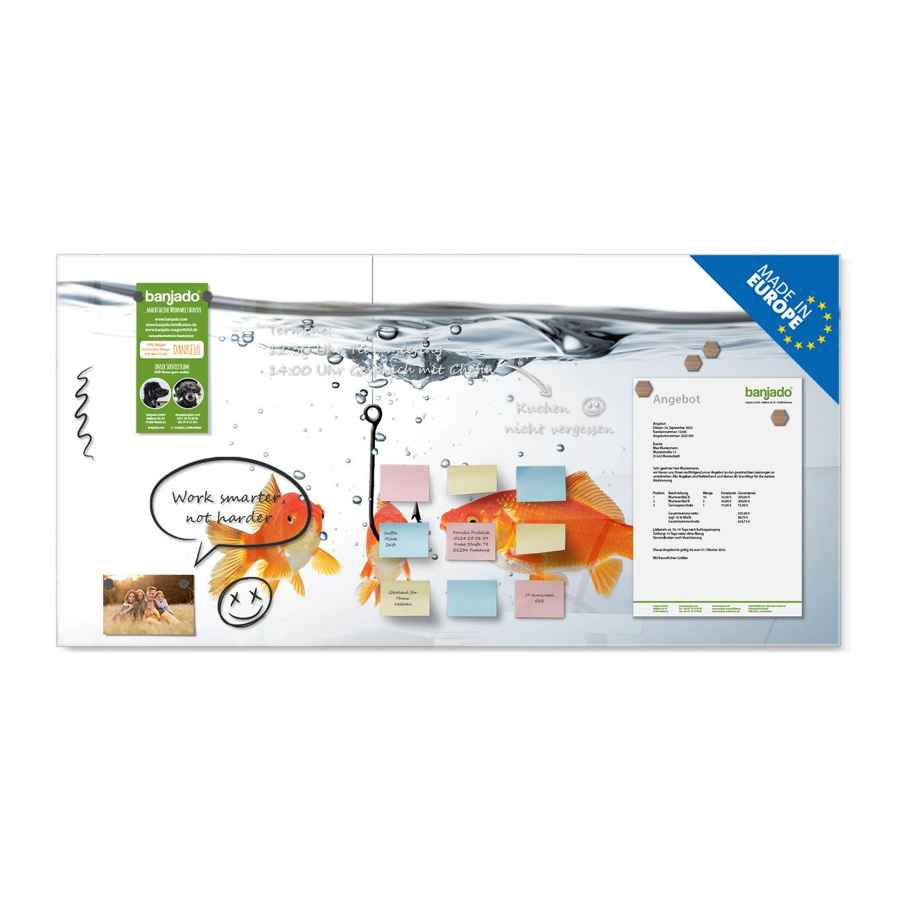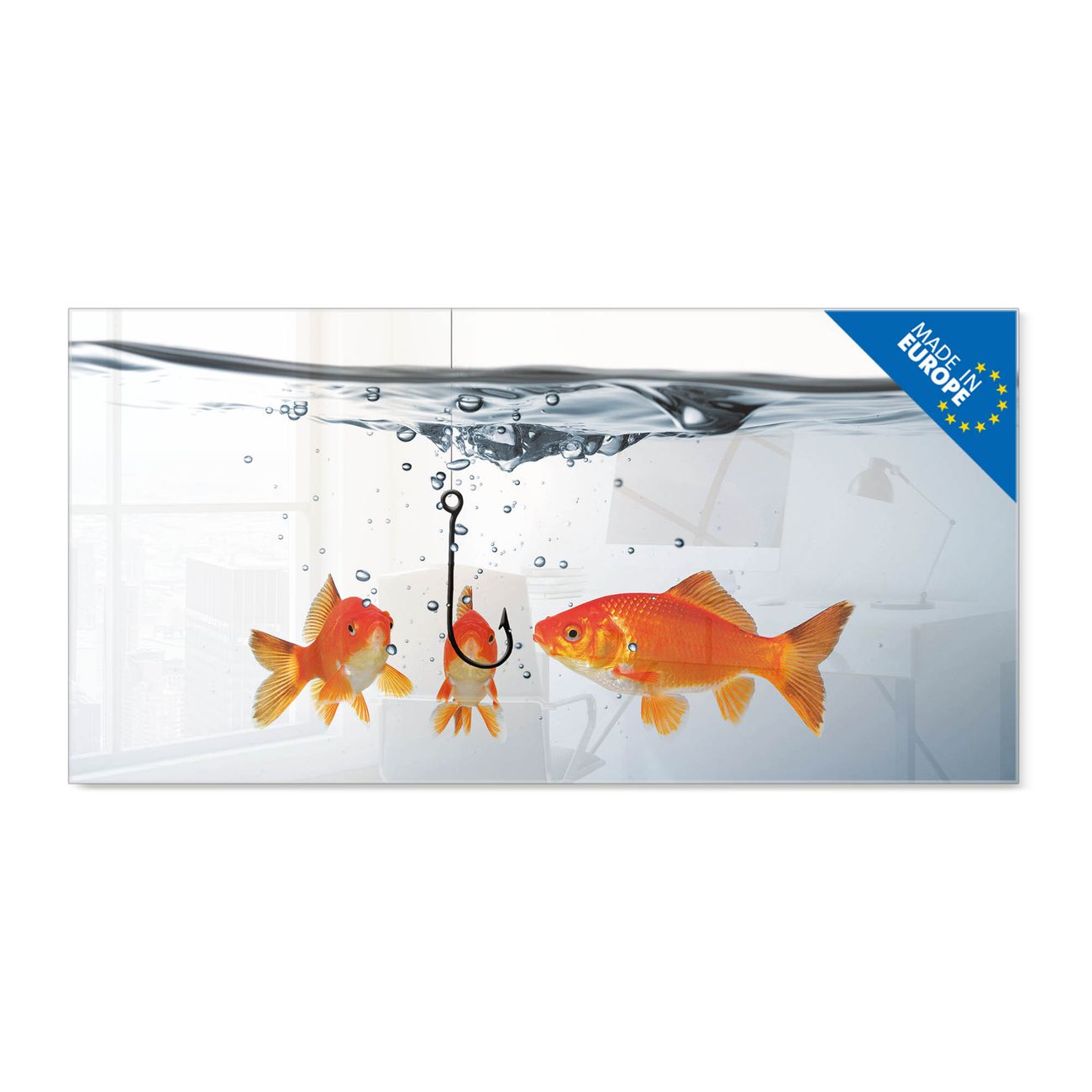 Material: 4mm Sicherheitsglas mit Metallrückwand Eigenschaften: beschreibbar, magnetisch, kratzfest Maße: 120x60x0,6cm, 10,80kg schwer Motiv Nummer 10184 Fische Zubehör: inklusive 4 Neodym-Magnete
