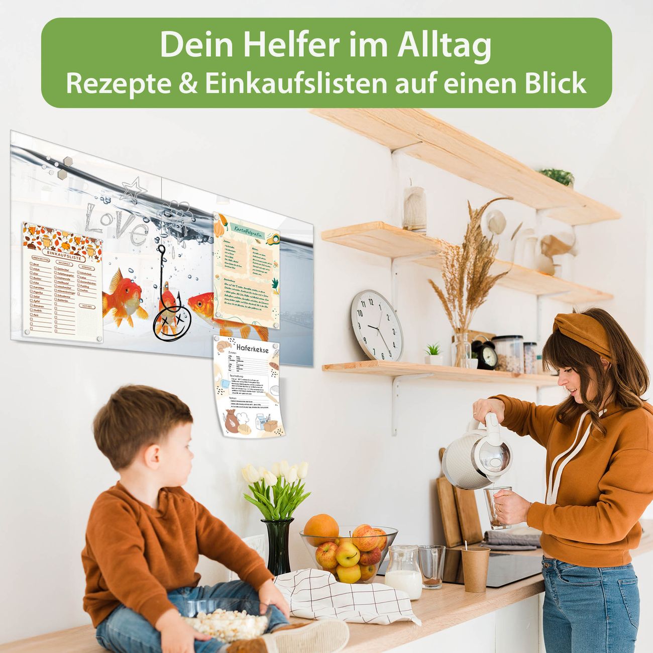 Ein Stück Design, das Ihren Alltag organisiert. Schreiben, heften, inspirieren - alles an einem Ort. Qualität, die man spürt. Montage leicht gemacht. Handwerk mit Herz - veredelt in Sachsen. Einzigartiges Design mit Motiv Motiv Fische Beschreibbare Glasoberfläche, leicht zu reinigen Starke Magnetkraft durch Stahlrückwand Inklusive 4 Neodym-Magneten Flexible Montageoptionen Handveredelt in Sachsen - Qualität, die bleibt
