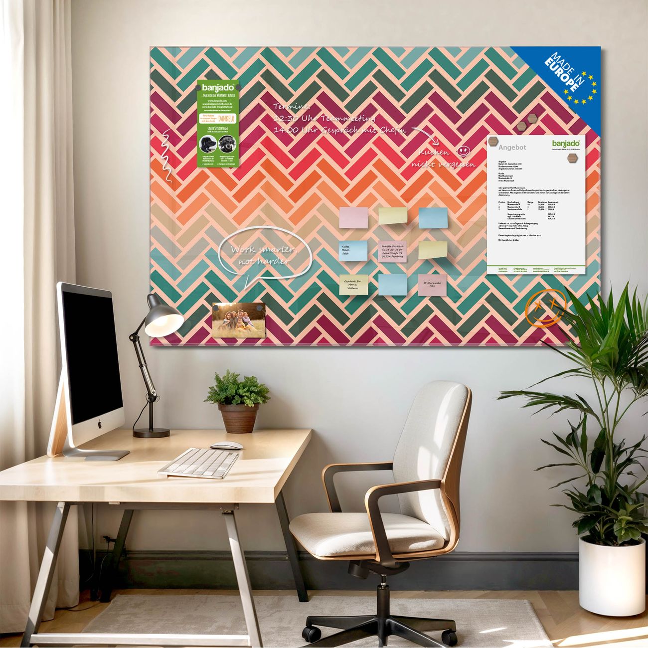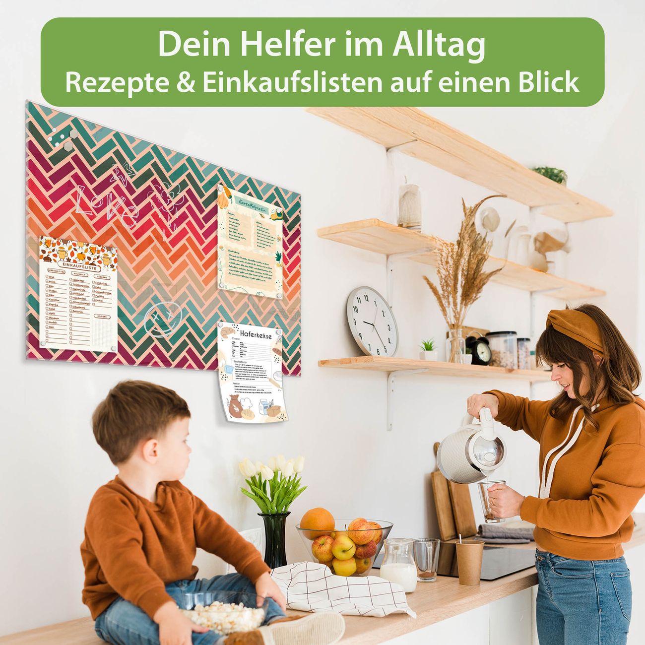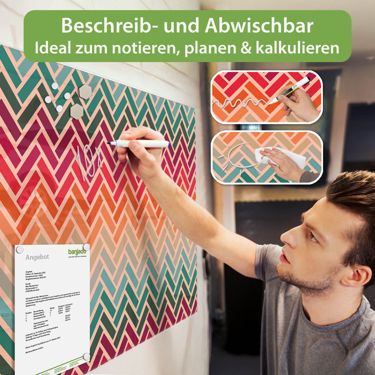 Die banjado Glas Magnettafel mit dem Motiv Motiv Fischgräten verbindet Funktionalität mit Stil. Sie ersetzt das Zettelchaos durch klare Strukturen und bringt dabei eine warme, natürliche Atmosphäre in Ihr Zuhause. Ob im Büro, in der Küche oder im Eingangsbereich - dieses Design-Board zieht Blicke an und sorgt für Ordnung mit Charakter.