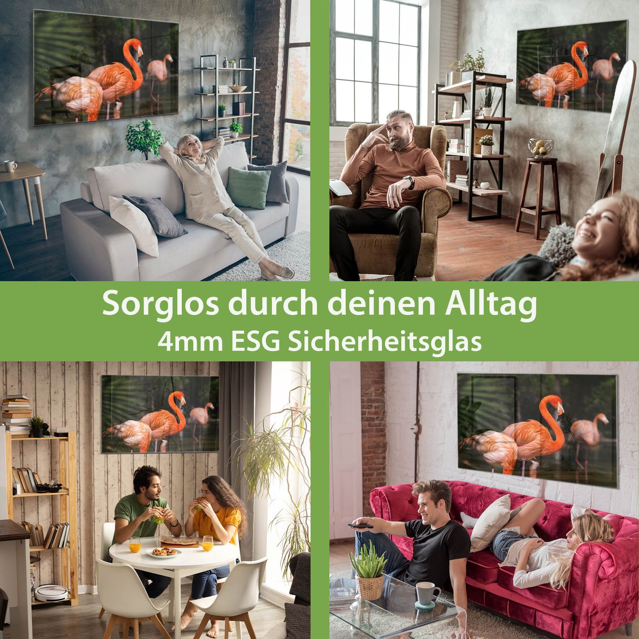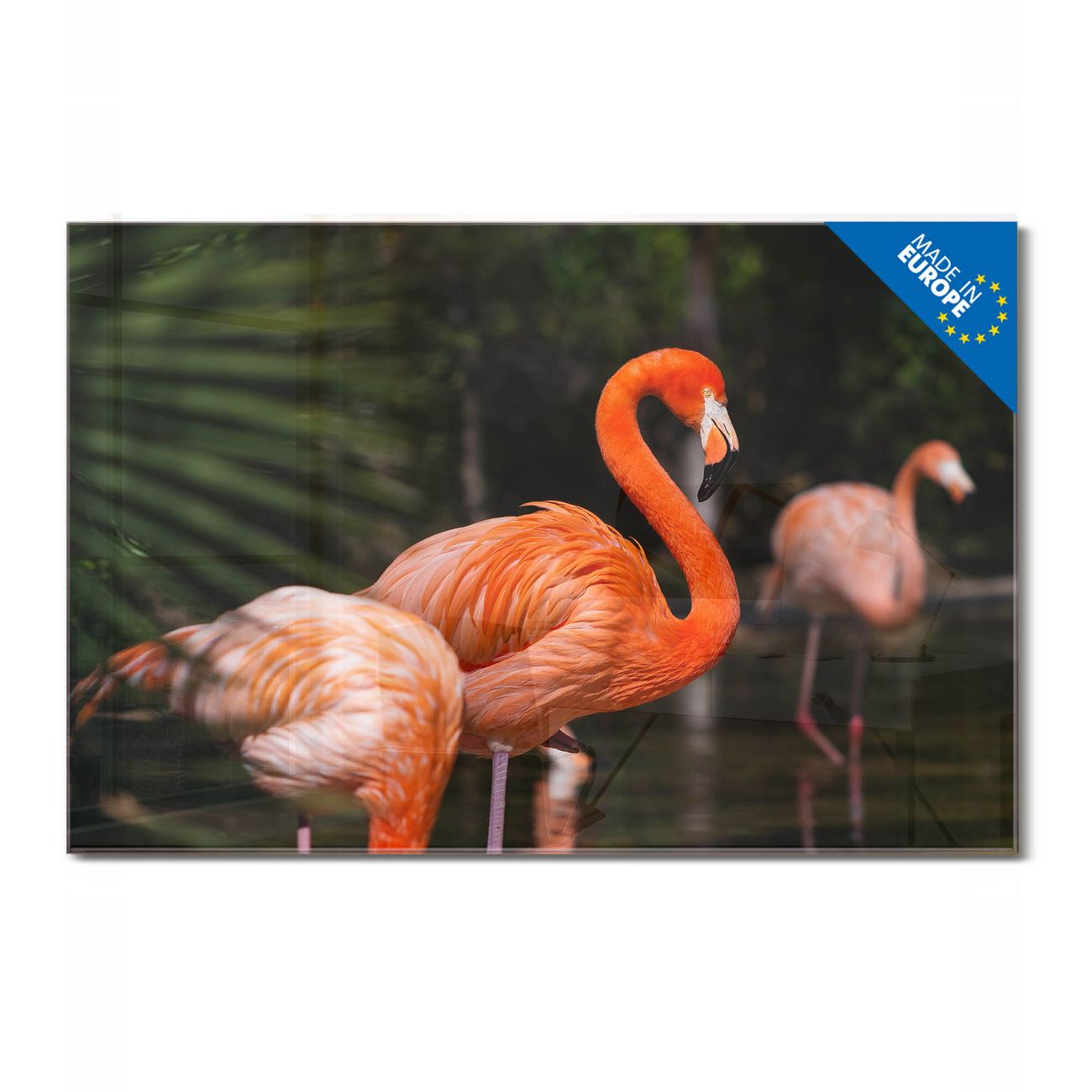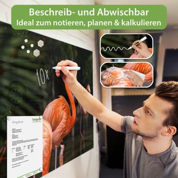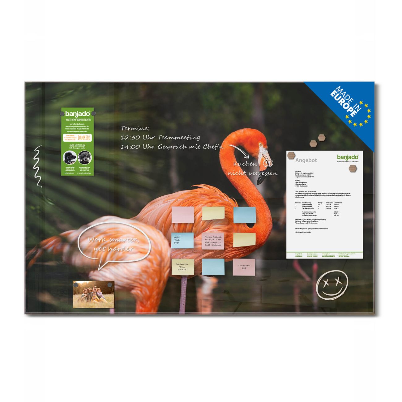 Material: 4mm Sicherheitsglas mit Metallrückwand Eigenschaften: beschreibbar, magnetisch, kratzfest Maße: 120x80x0,6cm, 14,40kg schwer Motiv Nummer 10501 Flamingo Zubehör: inklusive 4 Neodym-Magnete