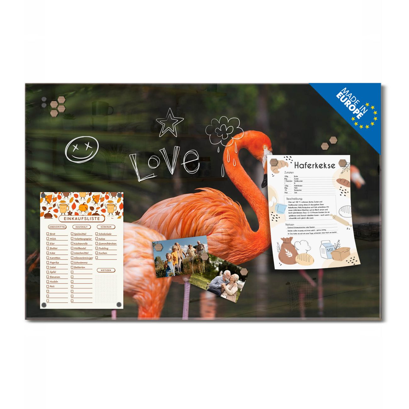 Material: 4mm Sicherheitsglas mit Metallrückwand Eigenschaften: beschreibbar, magnetisch, kratzfest Maße: 75x50x0,6cm, 5,63kg schwer Motiv Nummer 10501 Flamingo Zubehör: inklusive 4 Neodym-Magnete