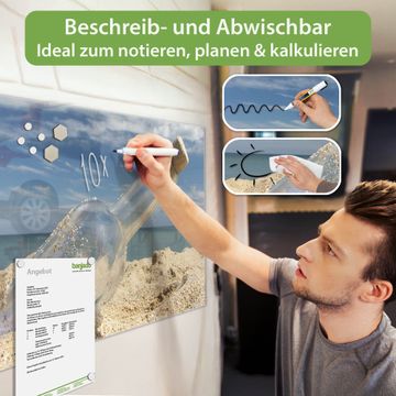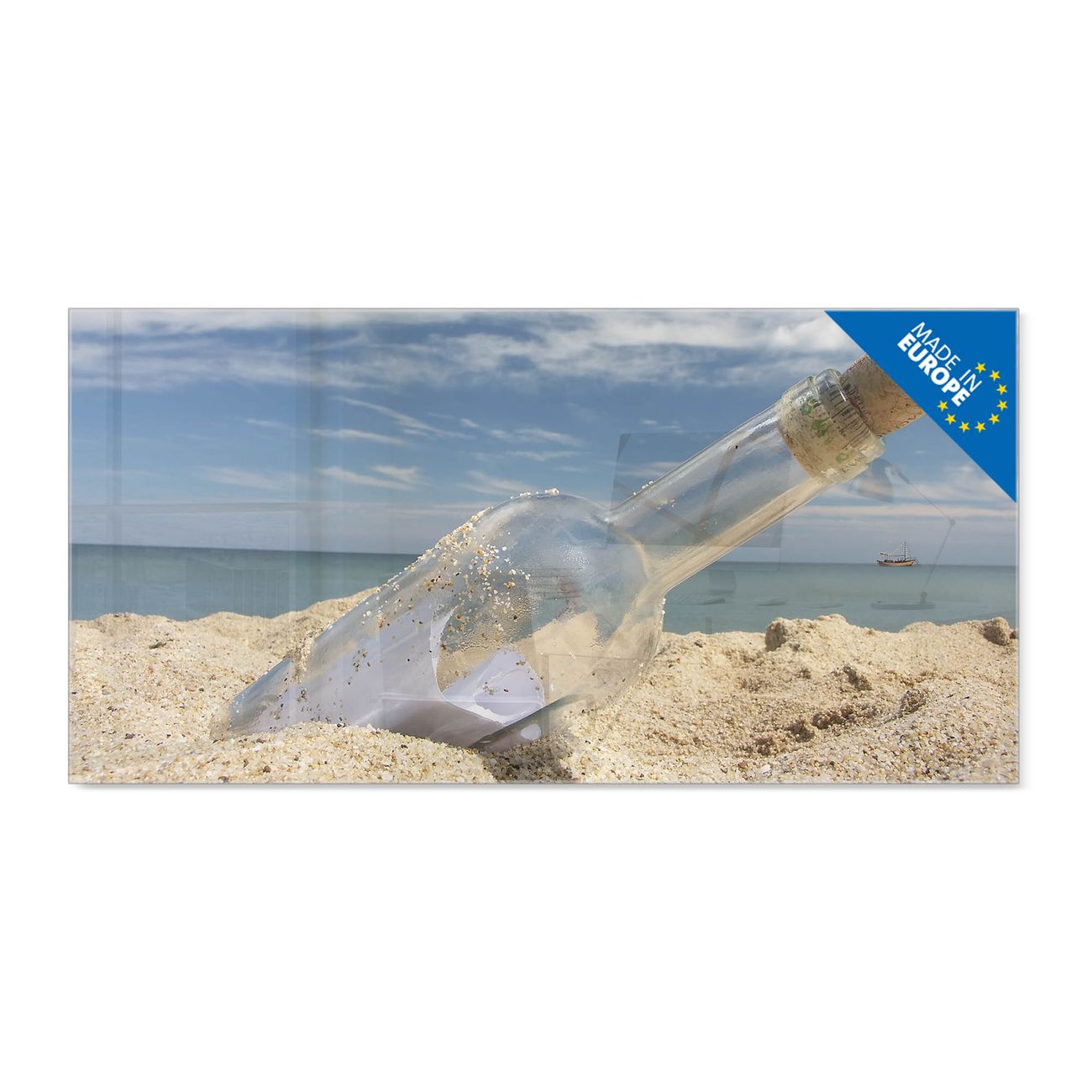 Material: 4mm Sicherheitsglas mit Metallrückwand Eigenschaften: beschreibbar, magnetisch, kratzfest Maße: 100x50x0,6cm, 7,50kg schwer Motiv Nummer 10286 Flaschenpost Zubehör: inklusive 4 Neodym-Magnete