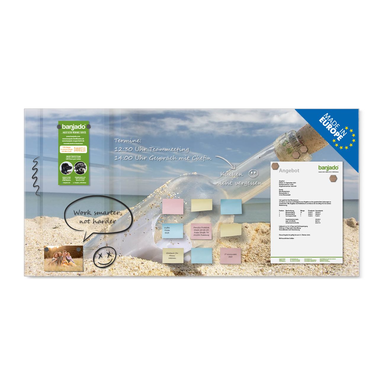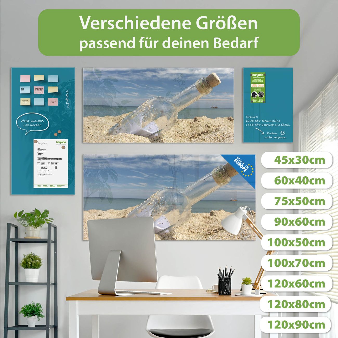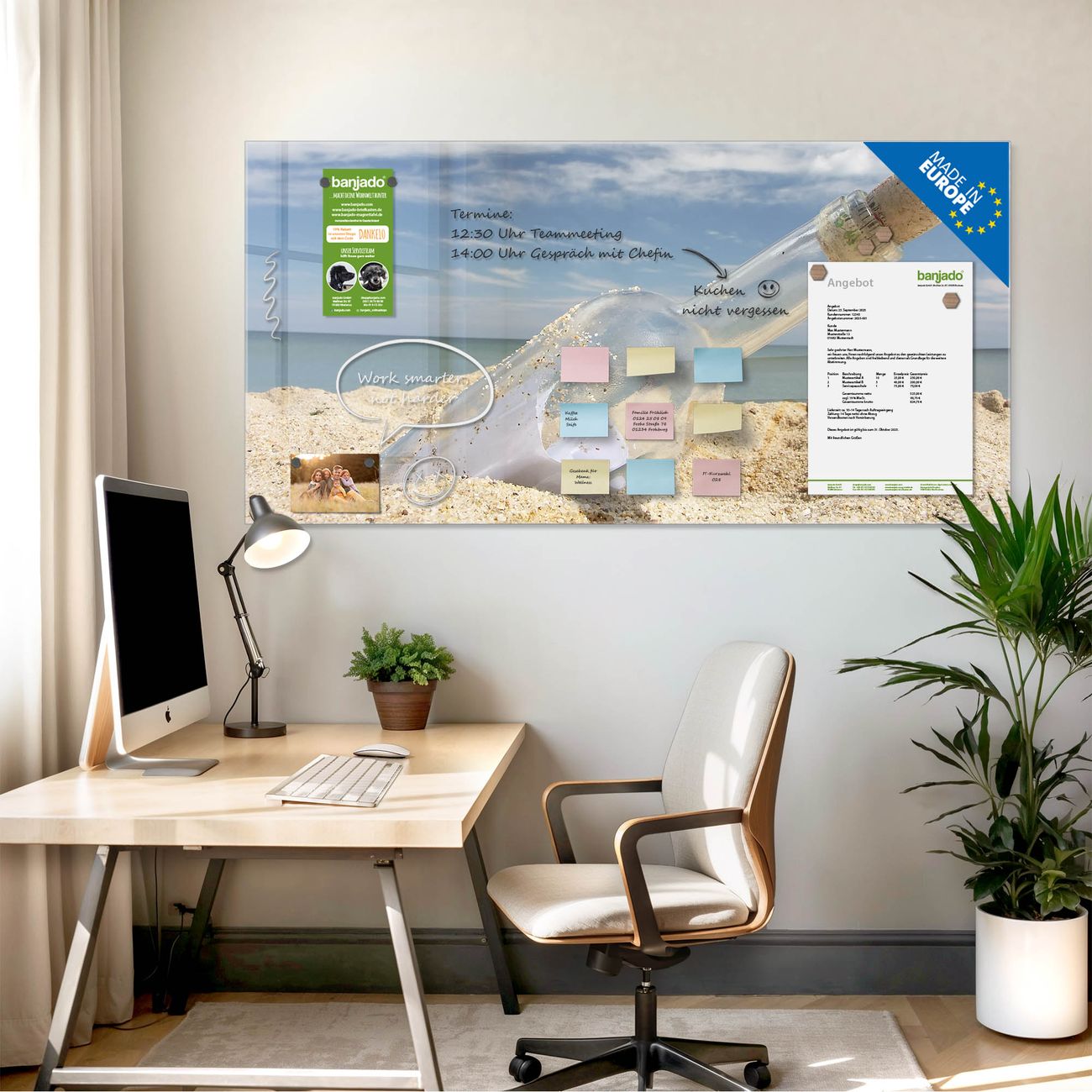 Jede Glas Magnettafel wird in unserer Werkstatt von Hand gefertigt und sorgfältig geprüft. So erhalten Sie ein echtes Qualitätsprodukt, das Funktion und Ästhetik perfekt vereint.?? Warum banjado?
