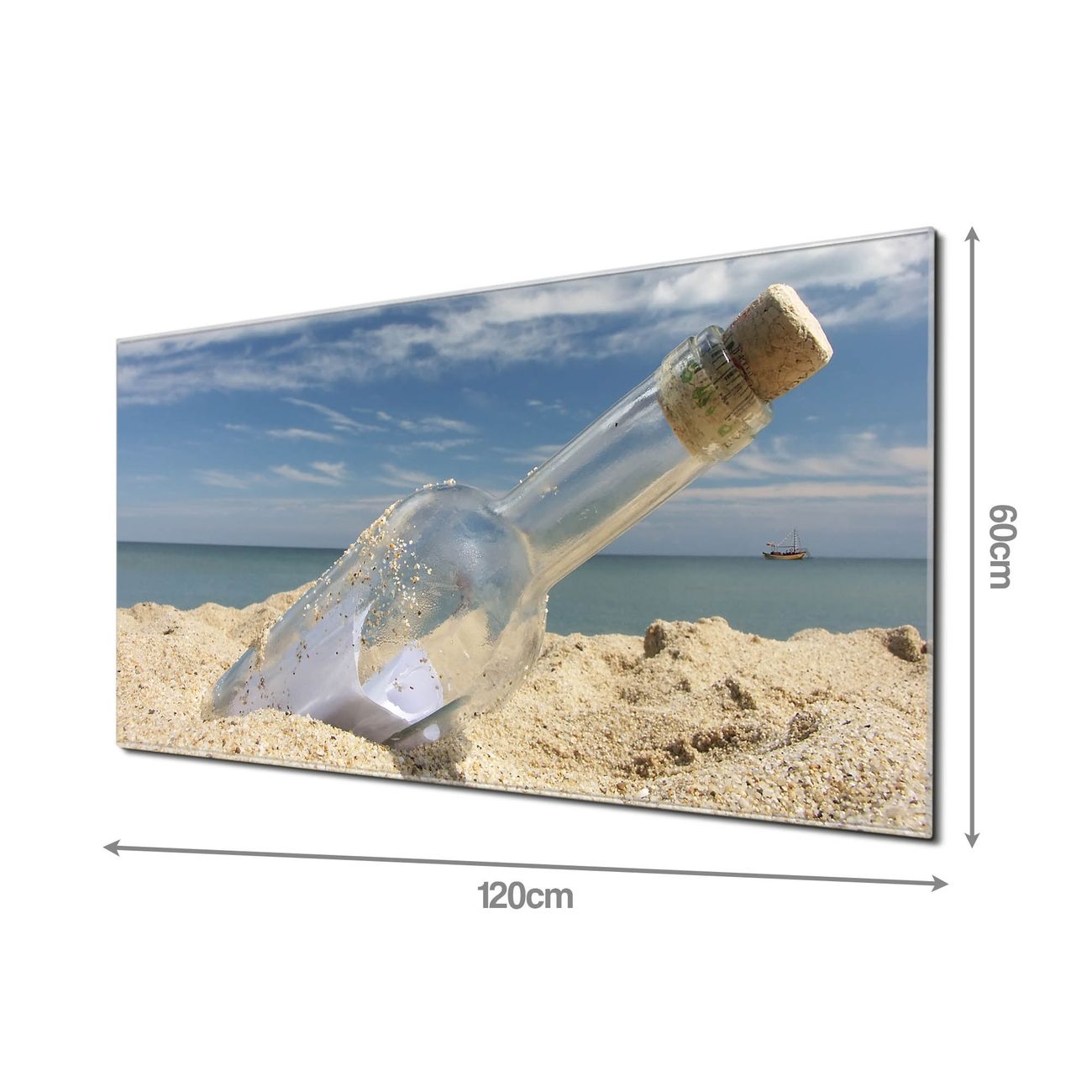 Material: 4mm Sicherheitsglas mit Metallrückwand Eigenschaften: beschreibbar, magnetisch, kratzfest Maße: 120x60x0,6cm, 10,80kg schwer Motiv Nummer 10286 Flaschenpost Zubehör: inklusive 4 Neodym-Magnete