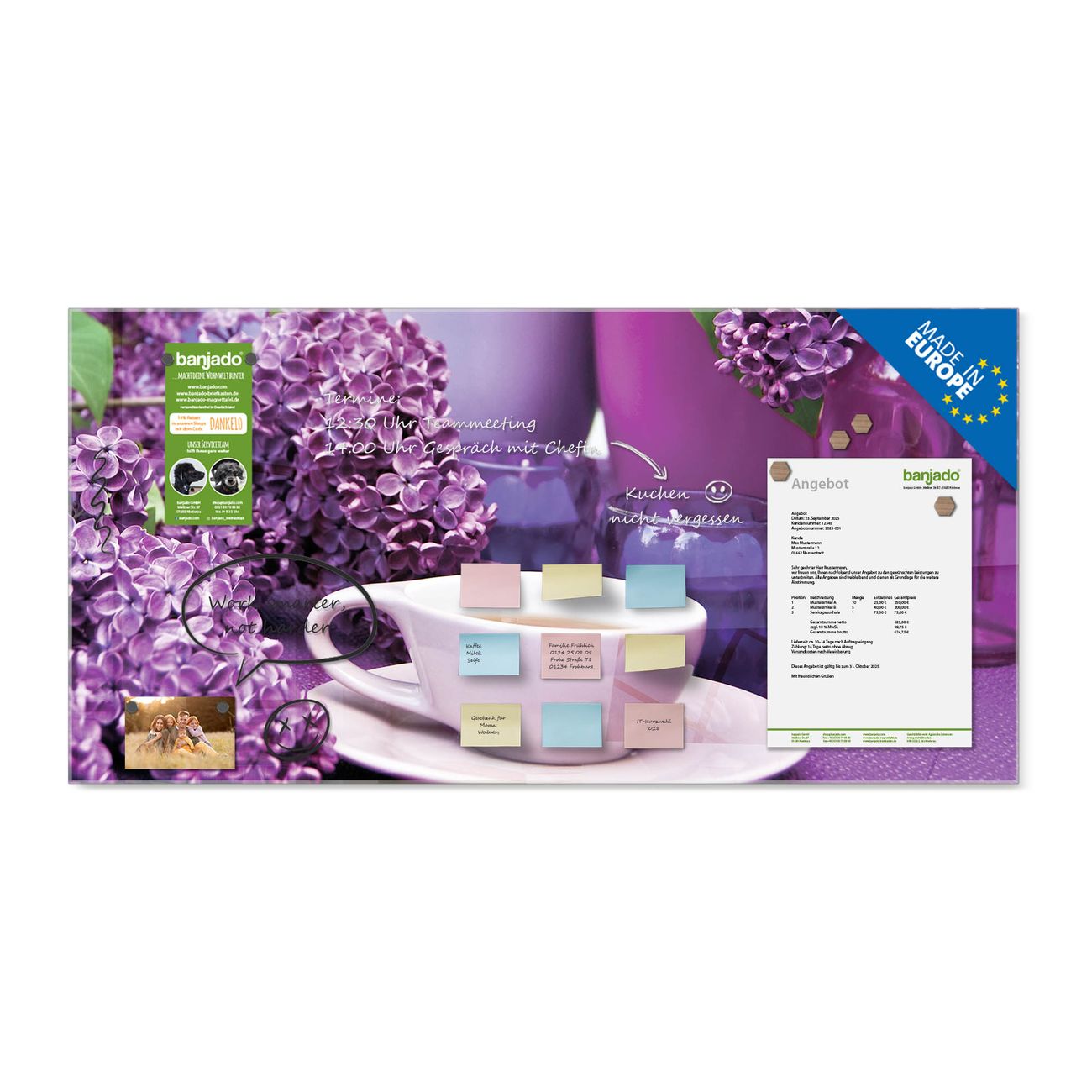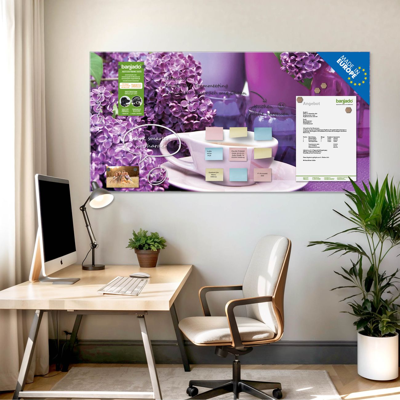 Jede Glas Magnettafel wird in unserer Werkstatt von Hand gefertigt und sorgfältig geprüft. So erhalten Sie ein echtes Qualitätsprodukt, das Funktion und Ästhetik perfekt vereint.?? Warum banjado?