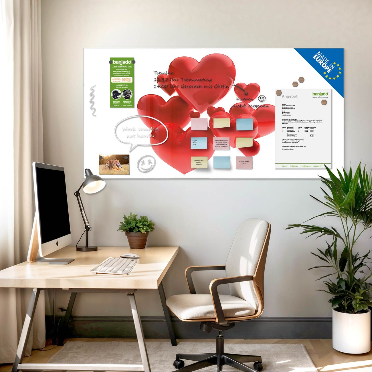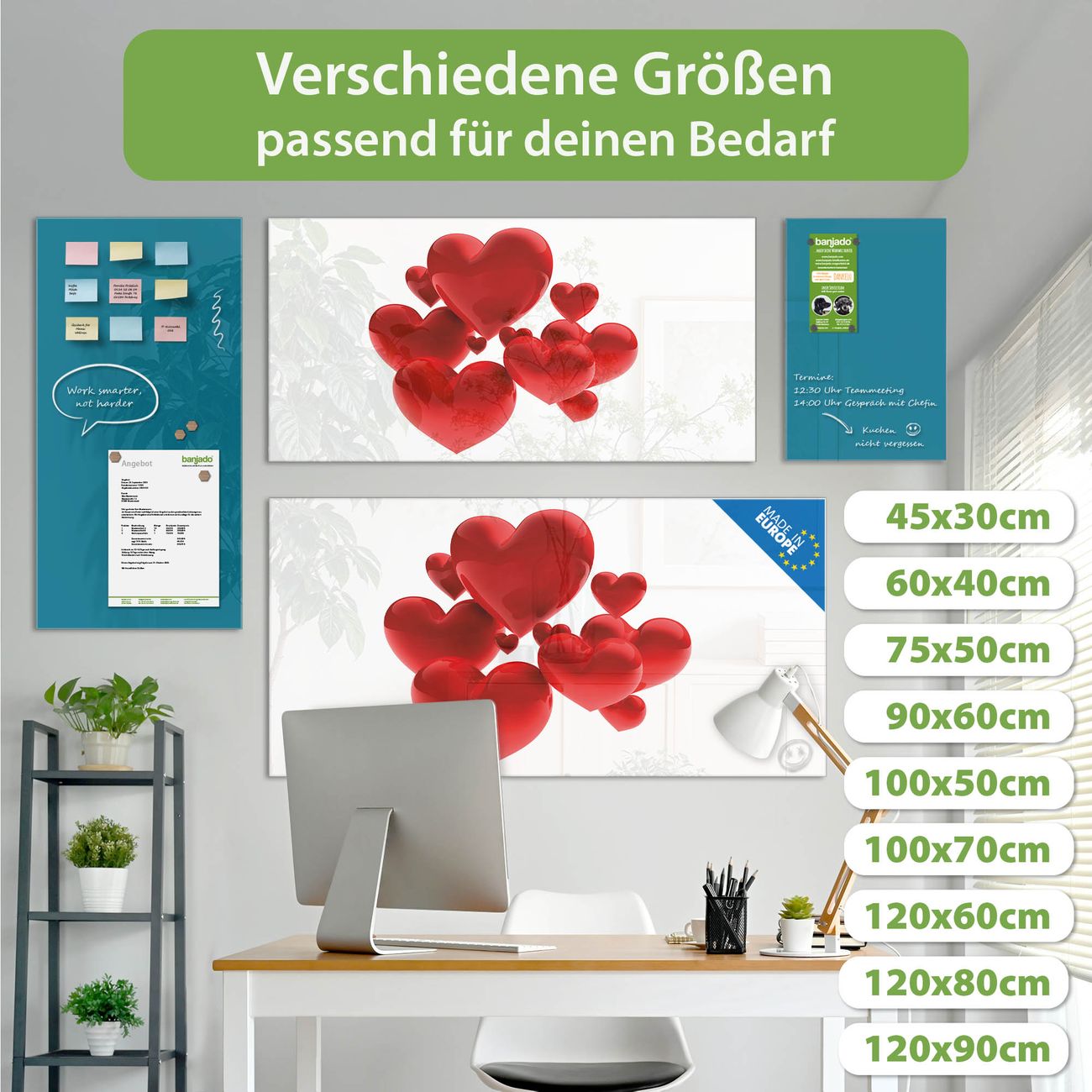 Material: 4mm Sicherheitsglas mit Metallrückwand Eigenschaften: beschreibbar, magnetisch, kratzfest Maße: 100x50x0,6cm, 7,50kg schwer Motiv Nummer 10228 Fliegende Herzen Zubehör: inklusive 4 Neodym-Magnete