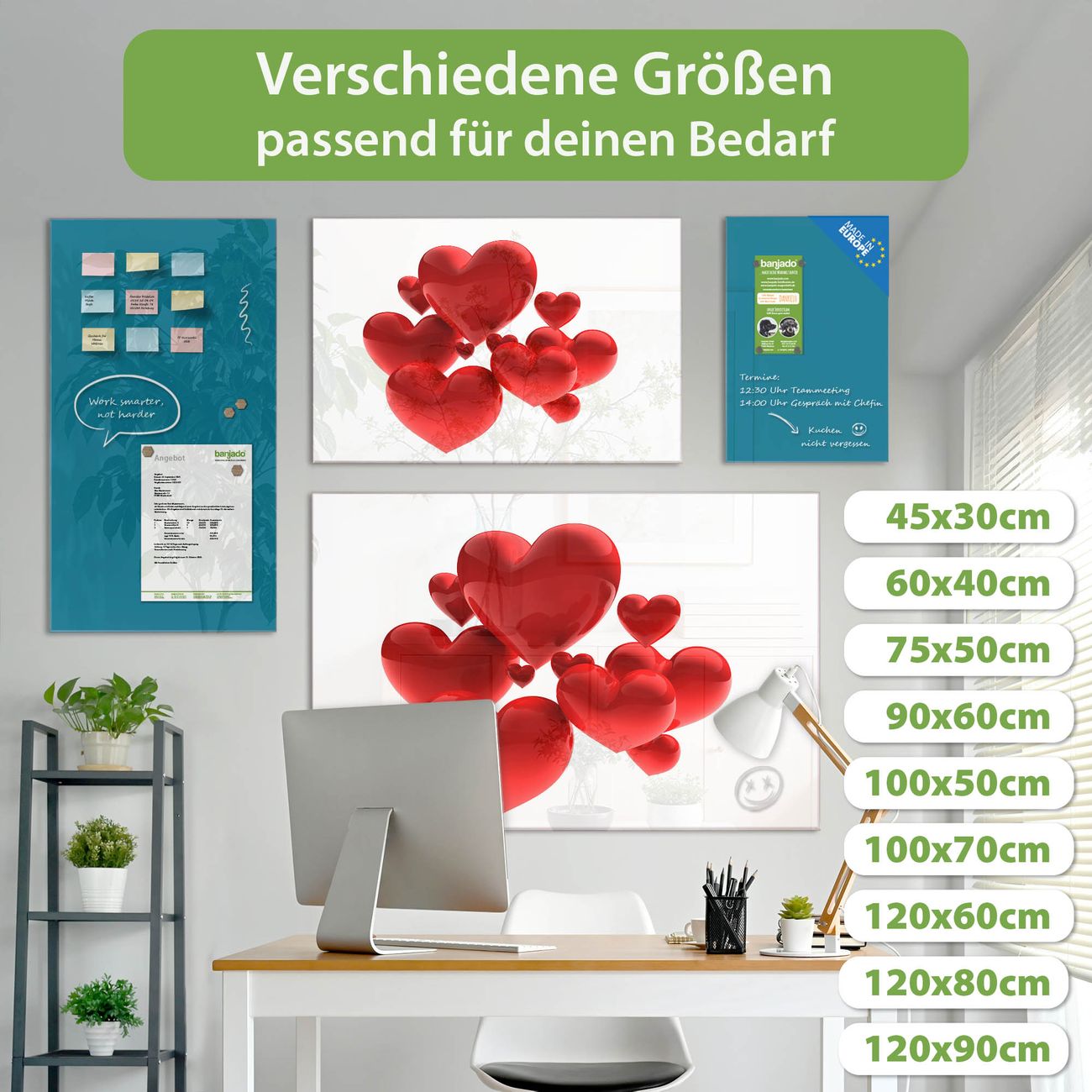 Material: 4mm Sicherheitsglas mit Metallrückwand Eigenschaften: beschreibbar, magnetisch, kratzfest Maße: 75x50x0,6cm, 5,63kg schwer Motiv Nummer 10228 Fliegende Herzen Zubehör: inklusive 4 Neodym-Magnete