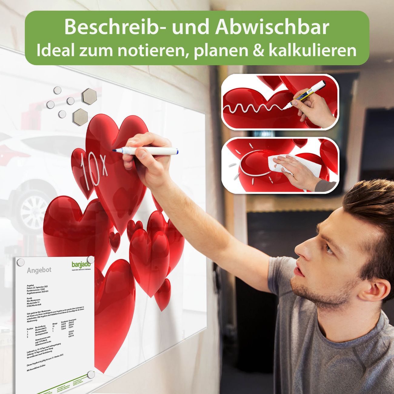 Auf der glatten Glasoberfläche lassen sich Termine, Rezepte oder Notizen ganz einfach mit Kreidestiften festhalten und rückstandslos entfernen. Starke Neodym-Magnete halten Ihre wichtigsten Erinnerungen sicher an Ort und Stelle. So entsteht Ihre ganz persönliche Ideenwand - jeden Tag neu.