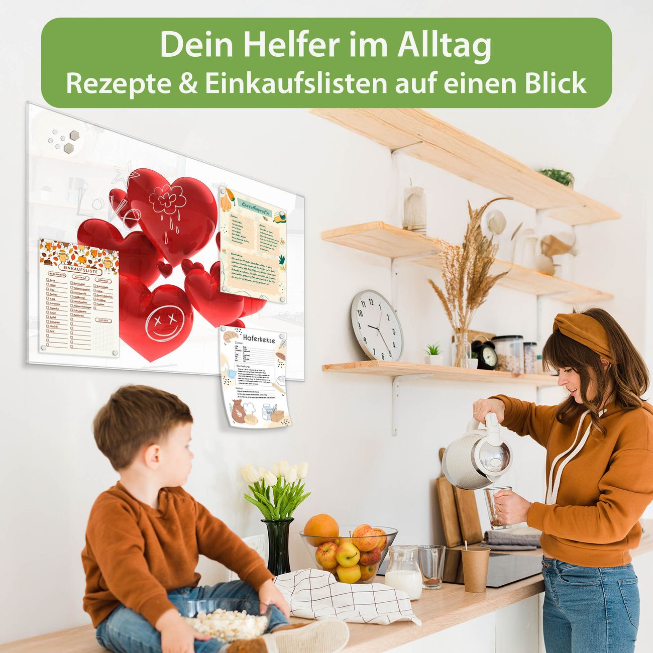 Ein Stück Design, das Ihren Alltag organisiert. Schreiben, heften, inspirieren - alles an einem Ort. Qualität, die man spürt. Montage leicht gemacht. Handwerk mit Herz - veredelt in Sachsen. Einzigartiges Design mit Motiv Motiv Fliegende Herzen Beschreibbare Glasoberfläche, leicht zu reinigen Starke Magnetkraft durch Stahlrückwand Inklusive 4 Neodym-Magneten Flexible Montageoptionen Handveredelt in Sachsen - Qualität, die bleibt