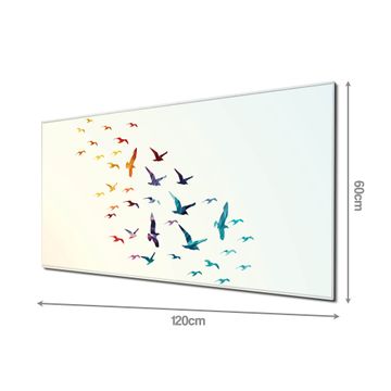 Material: 4mm Sicherheitsglas mit Metallrückwand Eigenschaften: beschreibbar, magnetisch, kratzfest Maße: 120x60x0,6cm, 10,80kg schwer Motiv Nummer 10738 Fliegende Vögel Zubehör: inklusive 4 Neodym-Magnete