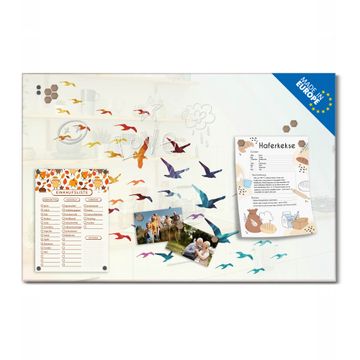 Material: 4mm Sicherheitsglas mit Metallrückwand Eigenschaften: beschreibbar, magnetisch, kratzfest Maße: 75x50x0,6cm, 5,63kg schwer Motiv Nummer 10738 Fliegende Vögel Zubehör: inklusive 4 Neodym-Magnete