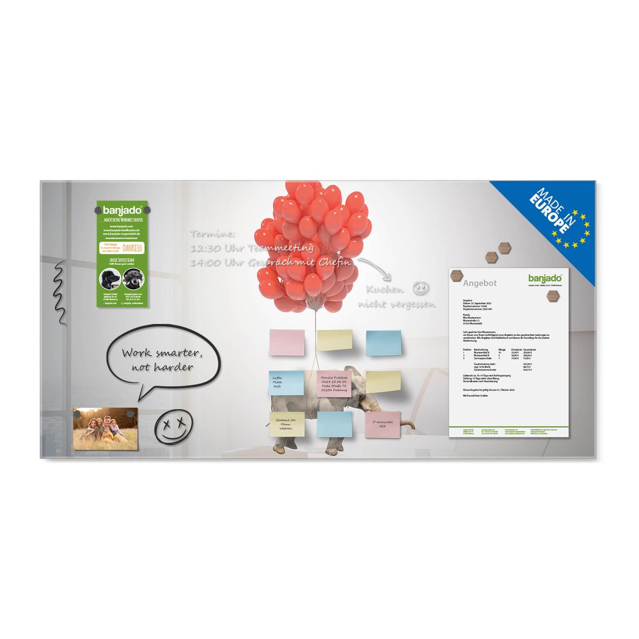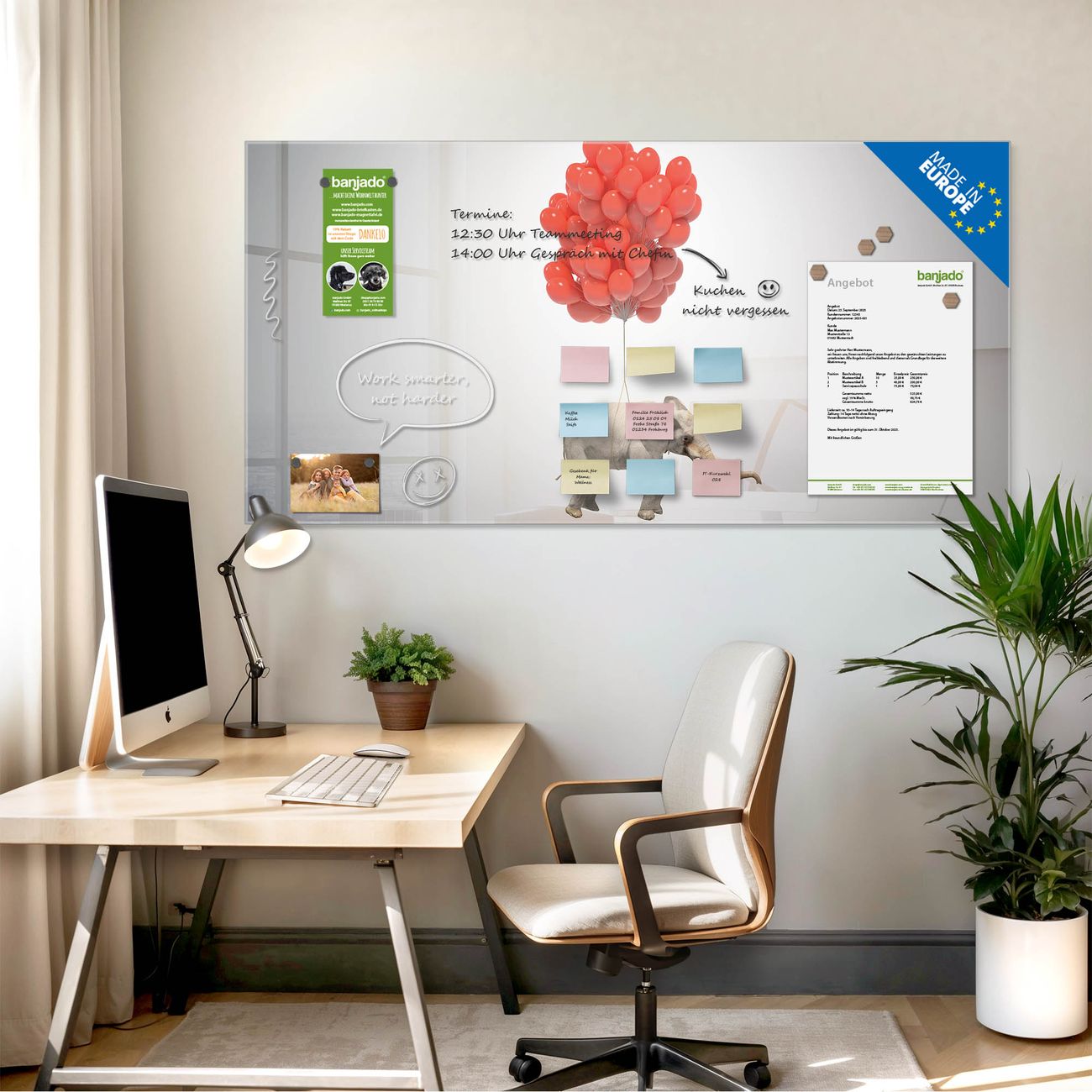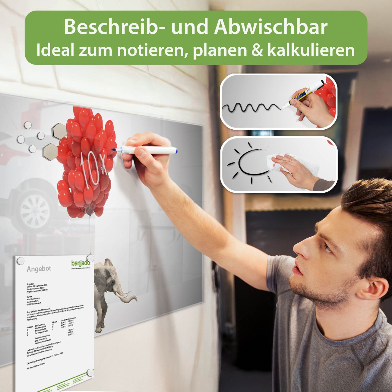 Jede Glas Magnettafel wird in unserer Werkstatt von Hand gefertigt und sorgfältig geprüft. So erhalten Sie ein echtes Qualitätsprodukt, das Funktion und Ästhetik perfekt vereint.?? Warum banjado?