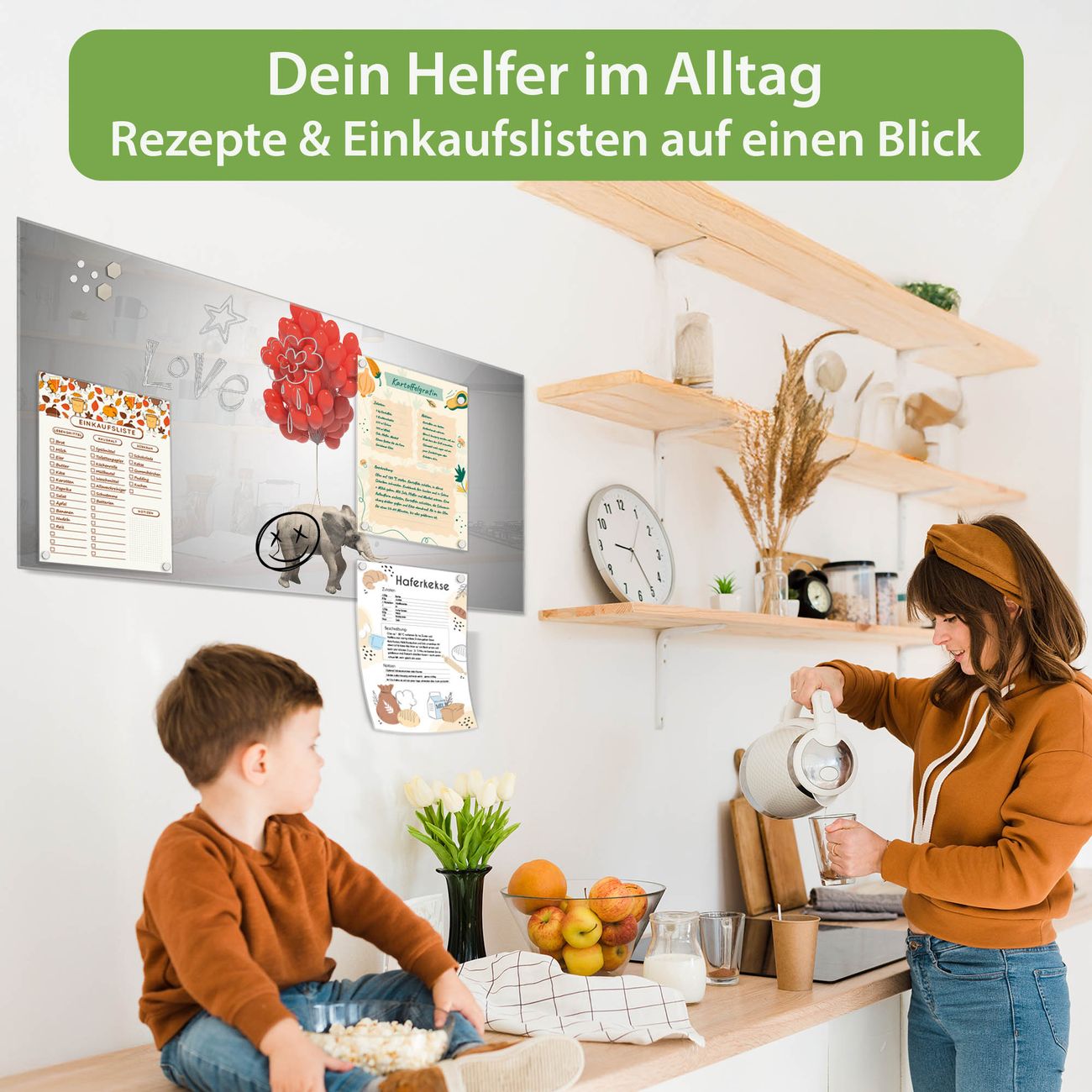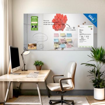 Auf der glatten Glasoberfläche lassen sich Termine, Rezepte oder Notizen ganz einfach mit Kreidestiften festhalten und rückstandslos entfernen. Starke Neodym-Magnete halten Ihre wichtigsten Erinnerungen sicher an Ort und Stelle. So entsteht Ihre ganz persönliche Ideenwand - jeden Tag neu.
