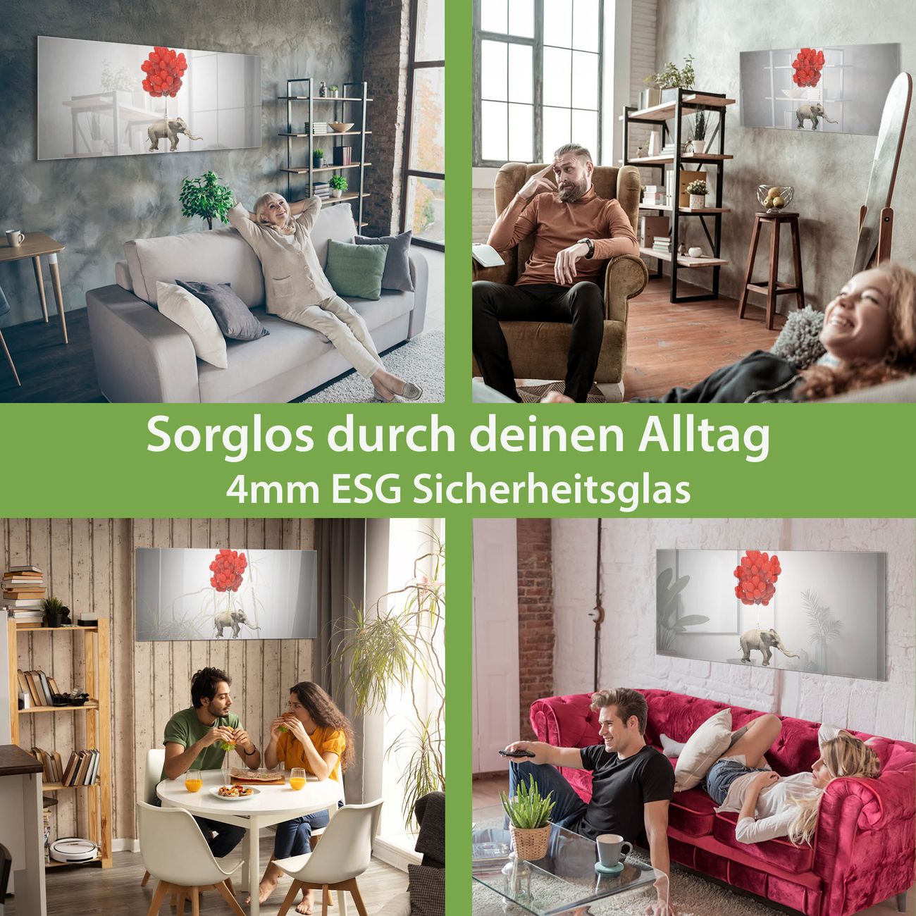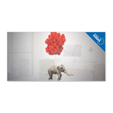 Material: 4mm Sicherheitsglas mit Metallrückwand Eigenschaften: beschreibbar, magnetisch, kratzfest Maße: 100x50x0,6cm, 7,50kg schwer Motiv Nummer 12482 Fliegender Elefant Zubehör: inklusive 4 Neodym-Magnete