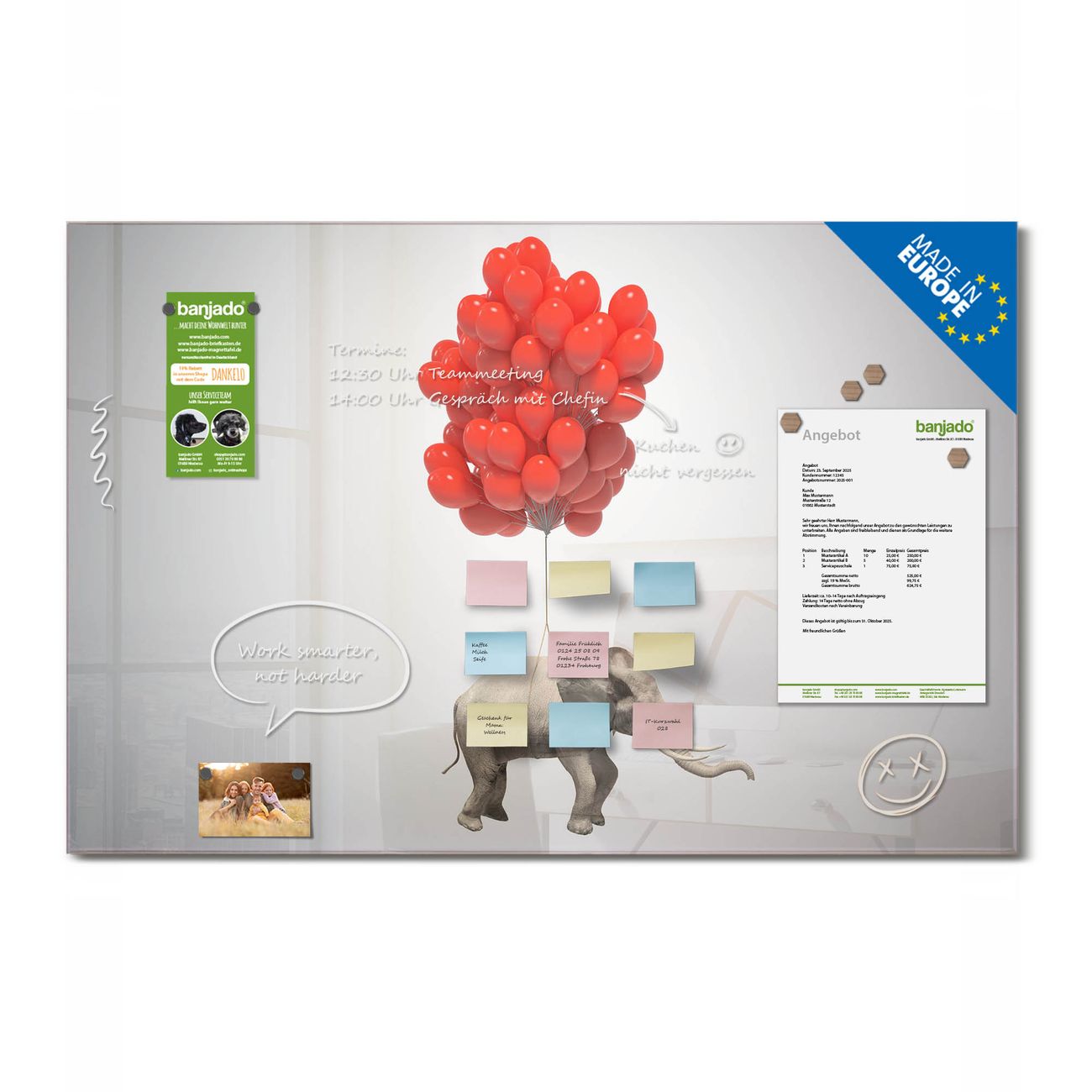 Jede Glas Magnettafel wird in unserer Werkstatt von Hand gefertigt und sorgfältig geprüft. So erhalten Sie ein echtes Qualitätsprodukt, das Funktion und Ästhetik perfekt vereint.?? Warum banjado?