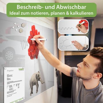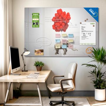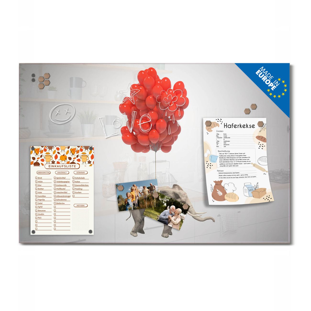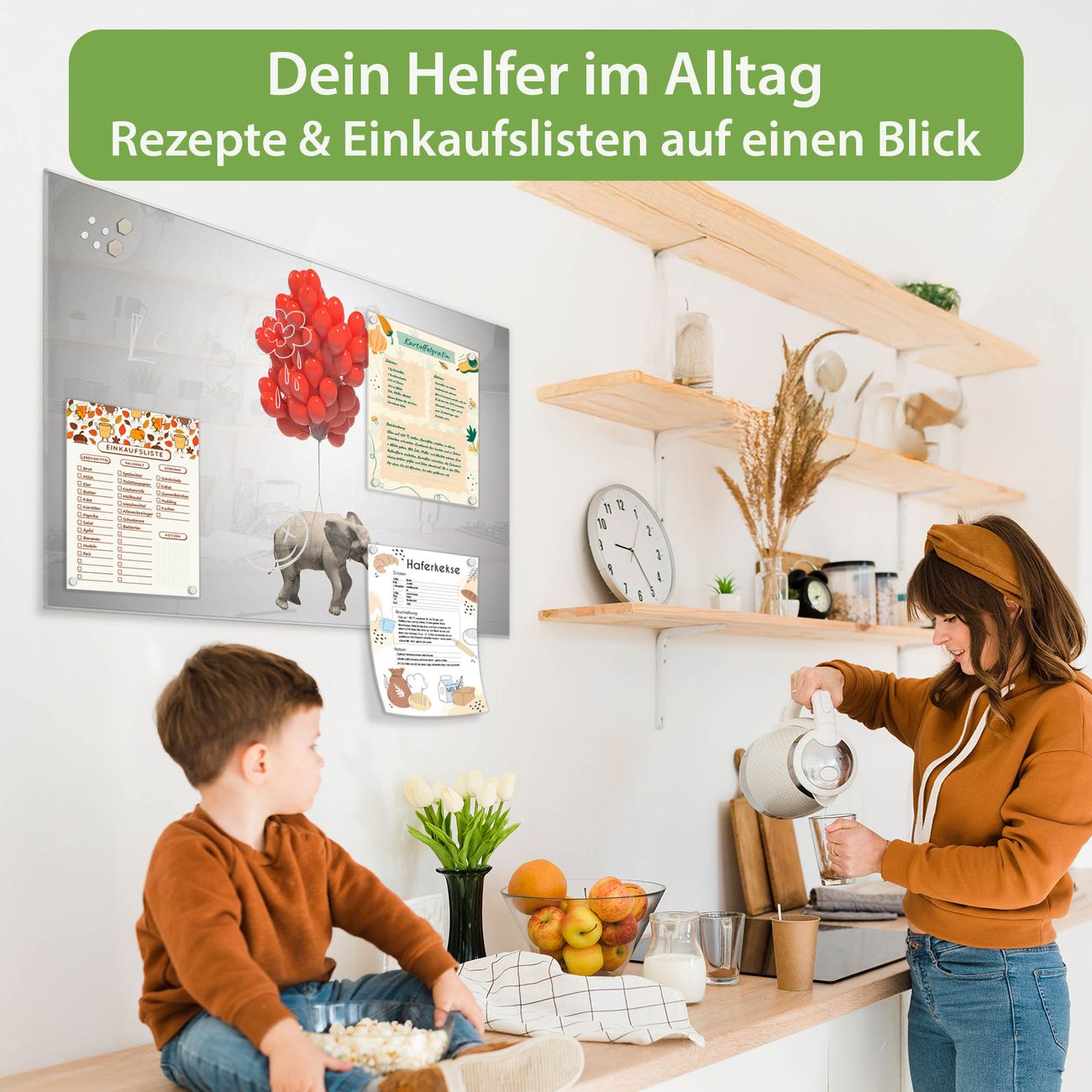 Auf der glatten Glasoberfläche lassen sich Termine, Rezepte oder Notizen ganz einfach mit Kreidestiften festhalten und rückstandslos entfernen. Starke Neodym-Magnete halten Ihre wichtigsten Erinnerungen sicher an Ort und Stelle. So entsteht Ihre ganz persönliche Ideenwand - jeden Tag neu.