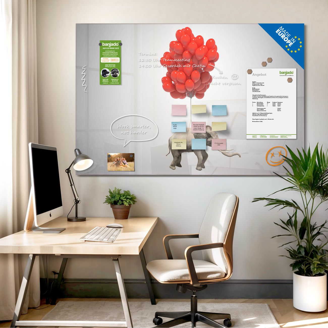 Die banjado Glas Magnettafel mit dem Motiv Motiv Fliegender Elefant verbindet Funktionalität mit Stil. Sie ersetzt das Zettelchaos durch klare Strukturen und bringt dabei eine warme, natürliche Atmosphäre in Ihr Zuhause. Ob im Büro, in der Küche oder im Eingangsbereich - dieses Design-Board zieht Blicke an und sorgt für Ordnung mit Charakter.