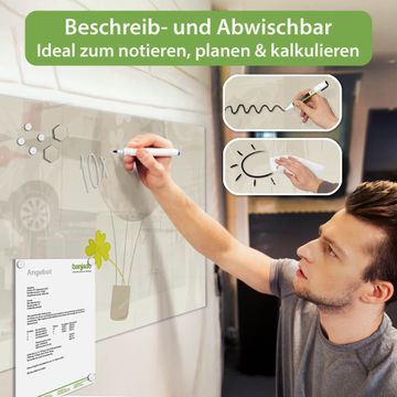 Auf der glatten Glasoberfläche lassen sich Termine, Rezepte oder Notizen ganz einfach mit Kreidestiften festhalten und rückstandslos entfernen. Starke Neodym-Magnete halten Ihre wichtigsten Erinnerungen sicher an Ort und Stelle. So entsteht Ihre ganz persönliche Ideenwand - jeden Tag neu.